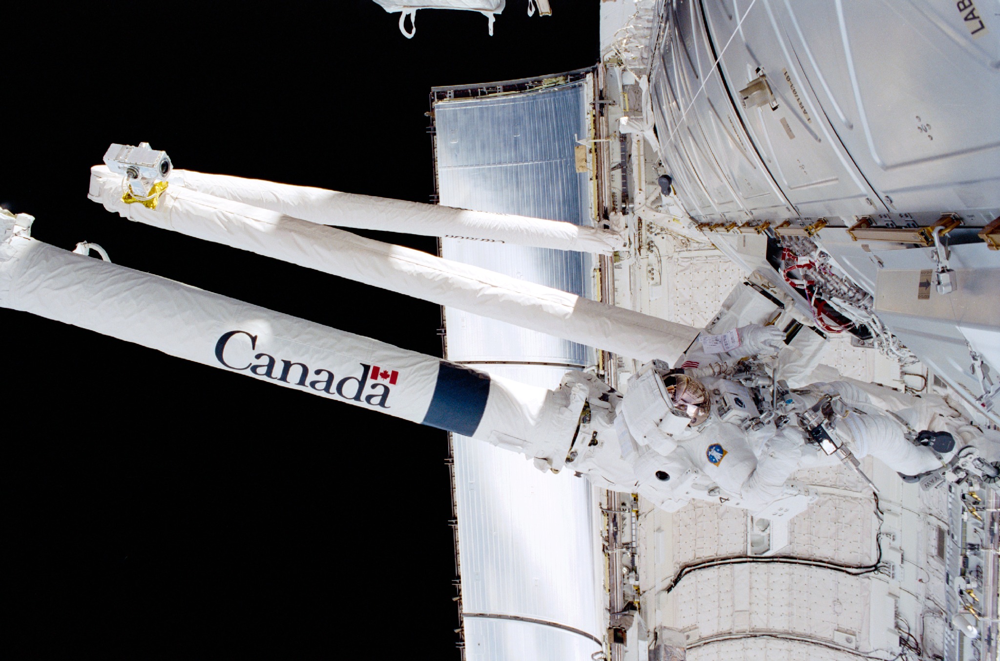 STS100-396-007 (19 April-1 May 2001) --- Astronaut Scott E. Parazynski, STS-100 mission specialist, works with cables associated with the Space Station Remote Manipulator System (SSRMS) or Canadarm2 during one of two days of extravehicular activity (EVA). Parazynski shared both space walks with astronaut Chris A. Hadfield of the Canadian Space Agency (CSA).