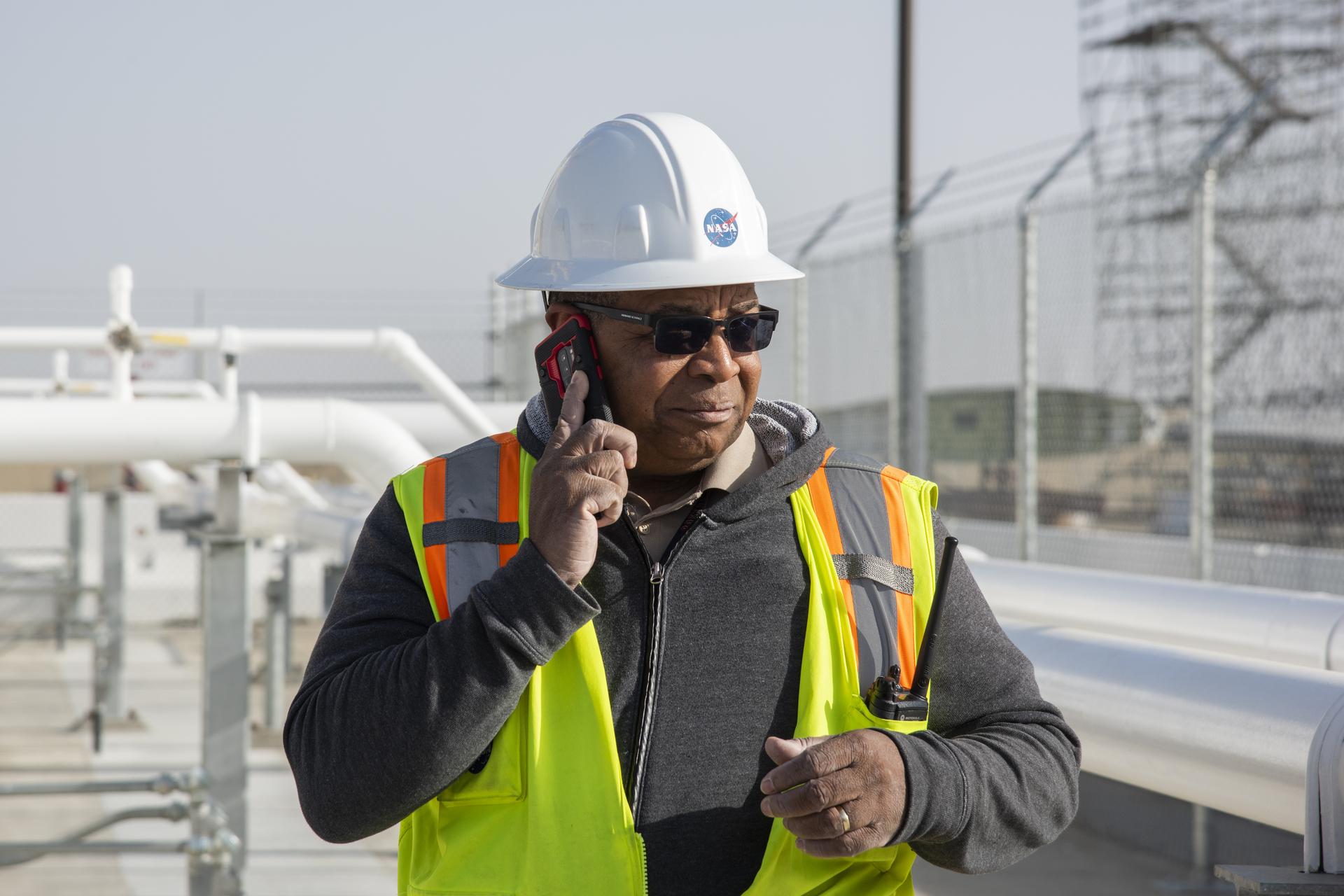 Syd Myers, a NASA Armstrong Flight Research Center confined space supervisor for a drill at NASA Armstrong Flight Research Center’s Building 703 in Palmdale, California, called 9-1-1 to begin the exercise. Myers continued to update responders how the situation was evolving until help arrived.
