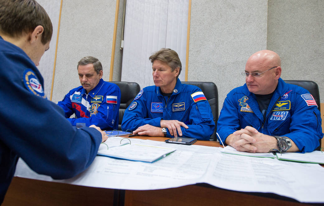 201503210002hq (03/21/2015) — Expedition 43 Russian Cosmonauts Mikhail Kornienko, left, and Gennady Padalka of the Russian Federal Space Agency (Roscosmos), center, and NASA Astronaut Scott Kelly attend a briefing, Saturday, Mar. 21, 2015 at the Cosmonaut Hotel in Baikonur, Kazakhstan. Kelly, Padalka, and Kornienko are preparing for launch to the International Space Station in their Soyuz TMA-16M spacecraft from the Baikonur Cosmodrome in Kazakhstan March 27. As the one-year crew, Kelly and Kornienko will return to Earth on Soyuz TMA-18M in March 2016. Photo Credit: (NASA/Bill Ingalls)