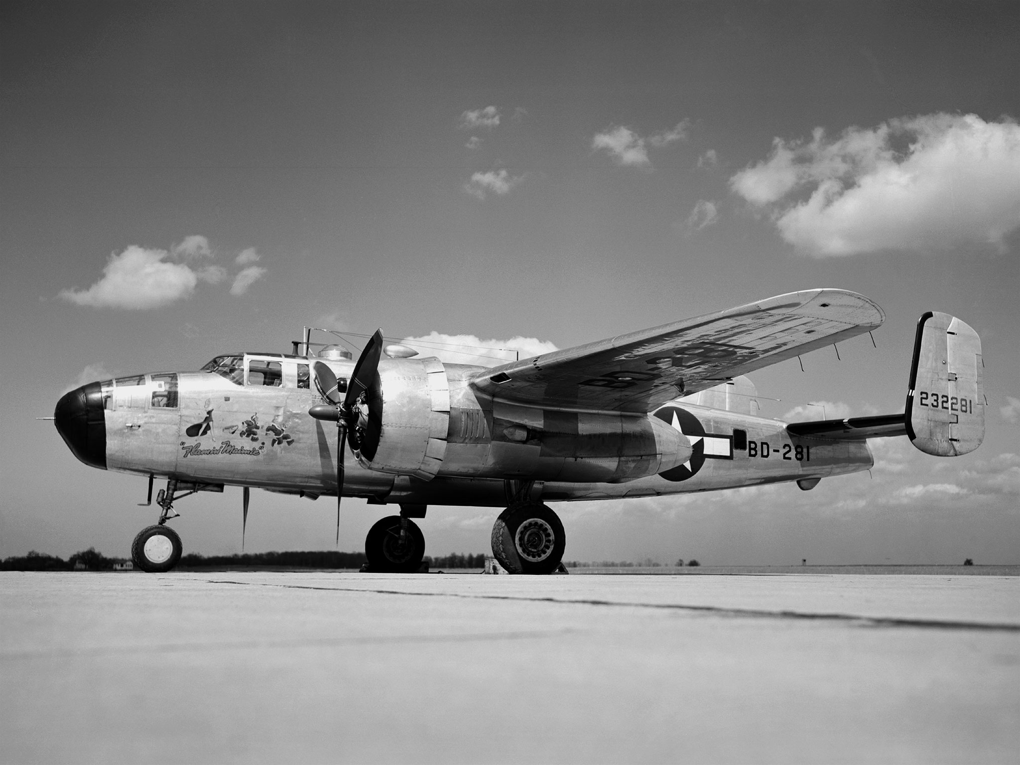 In 1946 the Lewis Flight Propulsion Laboratory became the NACA’s official icing research center. In addition to the Icing Research Tunnel, the lab possessed several aircraft modified for icing work, including a Consolidated B-24M Liberator and a North American XB-25E Mitchell, seen here. The XB-25E’s frequent engine fires allegedly resulted in its “Flamin’ Maimie” nickname. The aircraft’s nose art, visible in this photograph, includes a leather-jacketed mechanic with an extinguisher fleeing a fiery woman. North American developed the B-25 in the mid-1930s as a transport aircraft, but it was hurriedly reconfigured as a medium bomber for World War II. This XB-25E was a single prototype designed in 1942 specifically to test an exhaust gas ice prevention system developed by NACA researcher Lewis Rodert. The system circulated the engines’ hot bleed air to the wings, windshield, and tail. The XB-25E was utilized at the NACA’s Ames Aeronautical Laboratory for two years before being transferred to Cleveland in July 1944. NACA Lewis mechanics modified the aircraft further by installing electrical heating in the front fuselage, propellers, inboard sing, cowls, and antennae. Lewis pilots flew the B-24M and XB-25E into perilous weather conditions all across the country to study both deicing technologies and the physics of ice-producing clouds. These dangerous flights led to advances in weather sensing instruments and flight planning.