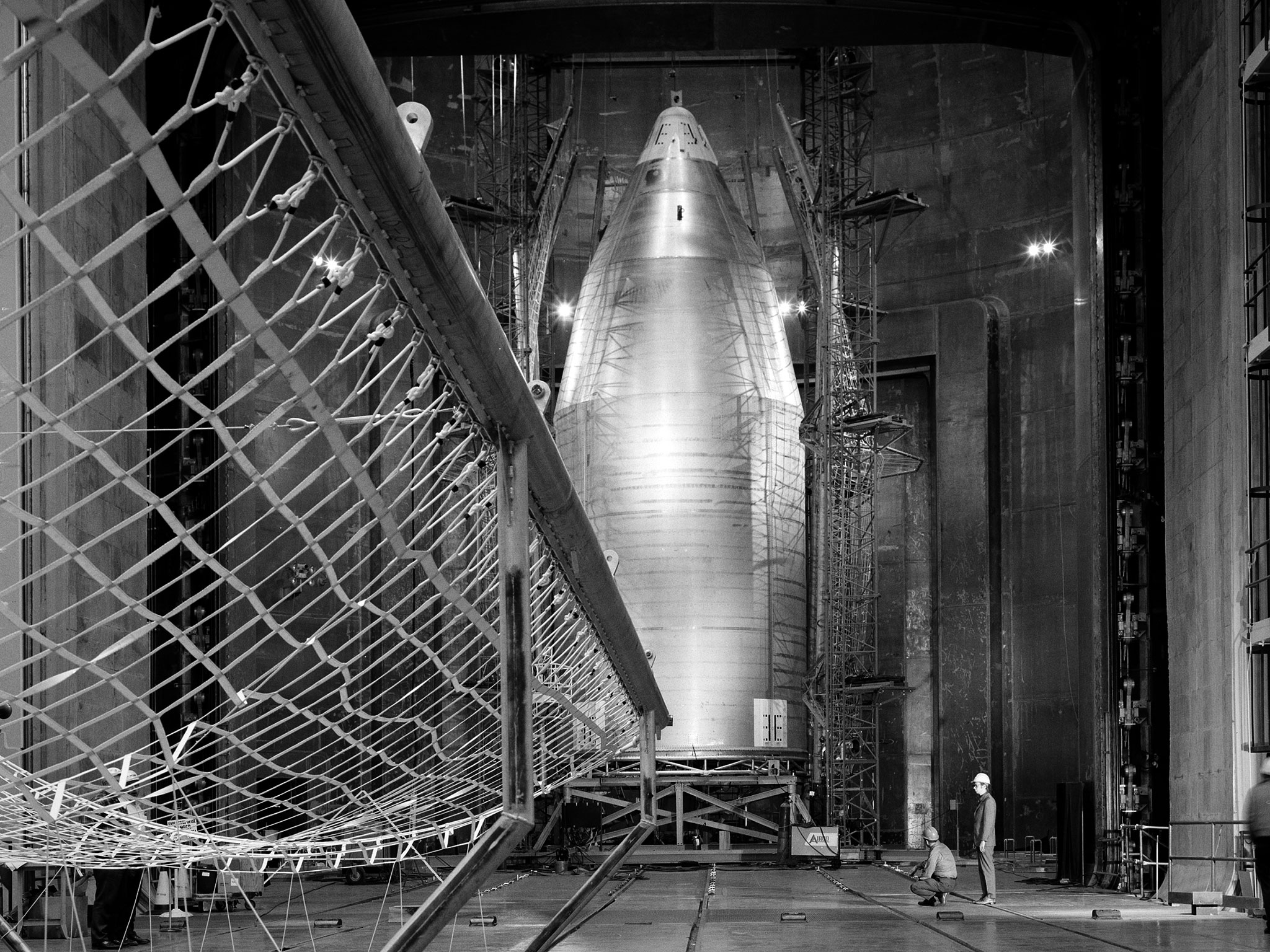 The 56-foot tall, 24,400-pound Skylab shroud installed in the Space Power Facility’s vacuum chamber at the National Aeronautics and Space Administration’s (NASA) Plum Brook Station. The Space Power Facility, which began operations in 1969, is the largest high vacuum chamber ever built. The chamber is 100 feet in diameter and 120 feet high. It can produce a vacuum deep enough to simulate the conditions at 300 miles altitude. The Space Power Facility was originally designed to test nuclear-power sources for spacecraft during long durations in a space atmosphere, but it was never used for that purpose. Payload shrouds are aerodynamic fairings to protect the payload during launch and ascent to orbit. The Skylab mission utilized the largest shroud ever attempted. Unlike previous launches, the shroud would not be jettisoned until the spacecraft reached orbit. NASA engineers designed these tests to verify the dynamics of the jettison motion in a simulated space environment. Fifty-four runs and three full-scale jettison tests were conducted from mid-September 1970 to June 1971. The shroud behaved as its designers intended, the detonators all fired, and early design issues were remedied by the final test. The Space Power Facility continues to operate today. The facility can sustain a high vacuum; simulate solar radiation via a 4-megawatt quartz heat lamp array, solar spectrum by a 400-kilowatt arc lamp, and cold environments. Test programs at the facility include high-energy experiments, shroud separation tests, Mars Lander system tests, deployable Solar Sail tests and International Space Station hardware tests.