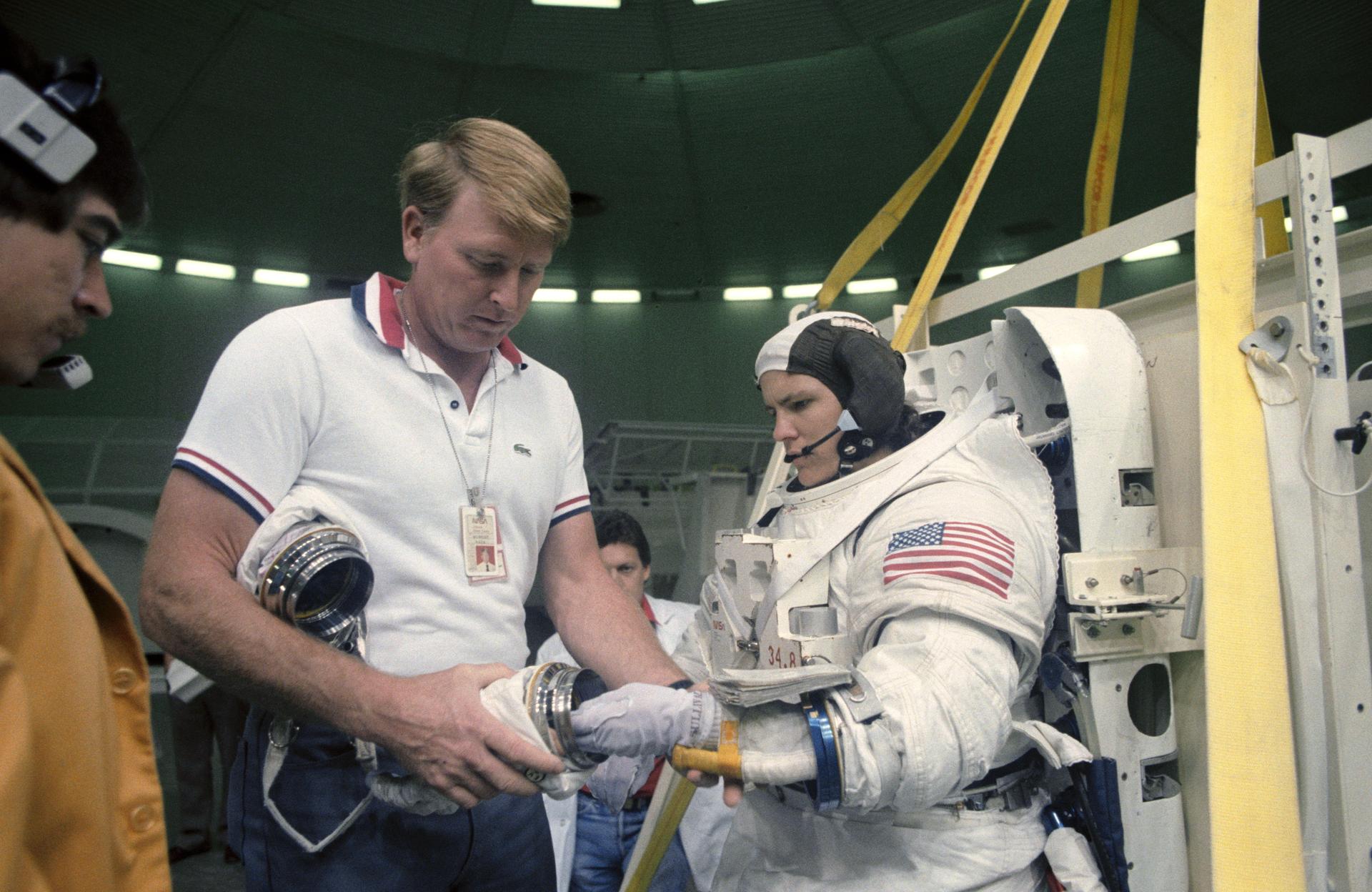 S84-33898 (21 May 1984) --- Astronaut Jon A. McBride, 41-G pilot, assists his crewmate, Astronaut Kathryn D. Sullivan with the glove portion of her extravehicular mobility unit (EMU) prior to Dr. Sullivan's underwater session in the Johnson Space Center's weightless environment training facility (WET-F). Mission specialists Sullivan and David C. Leestma are scheduled for extravehicular activity (EVA) on the Columbia for NASA's 17th scheduled flight.