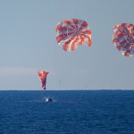 NASA’s Orion spacecraft with Artemis II crewmembers NASA astronauts Reid Wiseman, commander; Victor Glover, pilot; Christina Koch, mission specialist; and CSA (Canadian Space Agency) astronaut Jeremy Hansen, mission specialist aboard is seen under parachutes as it lands in the Pacific Ocean off the coast of California, Friday, April 10, 2026. NASA’s Artemis II mission took Wiseman, Glover, Koch, and Hansen on a 10-day journey around the Moon and back to Earth. Following a splashdown at 7:07 p.m. EDT, NASA, U.S. Navy, and U.S. Air Force teams are working to bring the crewmembers and Orion spacecraft aboard USS John P. Murtha.