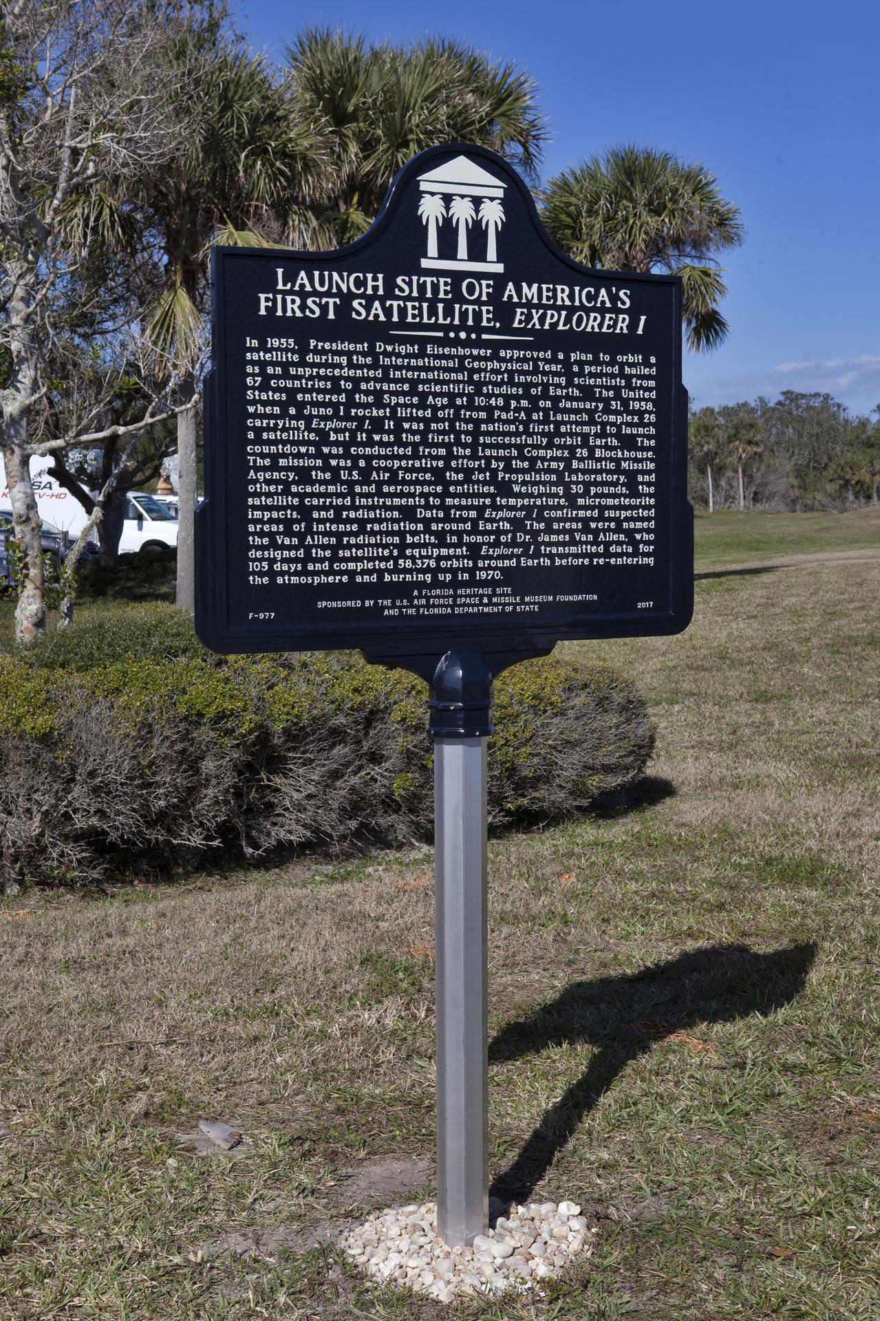 During a ceremony at Cape Canaveral Air Force Station's Space launch Complex 26 a historical marker has been unveiled noting the launch of America's first satellite, Explorer 1. The satellite was launched atop a Jupiter C rocket on Jan. 31, 1958. During operation, the satellite's cosmic ray detector discovered radiation belts around Earth which were named for Dr. James Van Allen, principal investigator for the satellite.