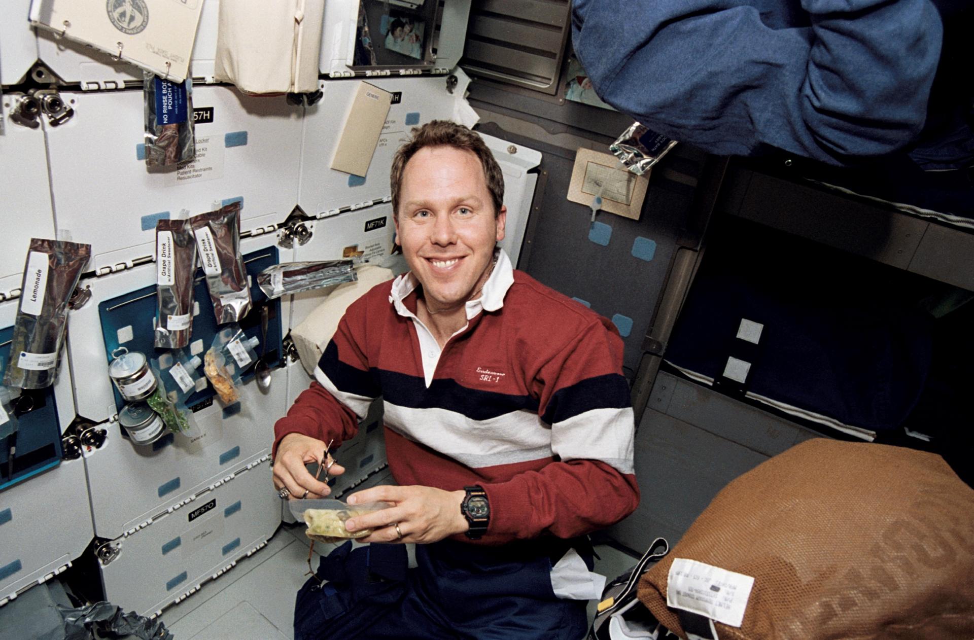STS059-14-004 (9-20 April 1994) --- On the Space Shuttle Endeavour's middeck astronaut Thomas D. Jones, mission specialist, cuts open a package of food as he prepares for mealtime. Jones was joined by five other NASA astronauts aboard Endeavour for the STS-59 mission.