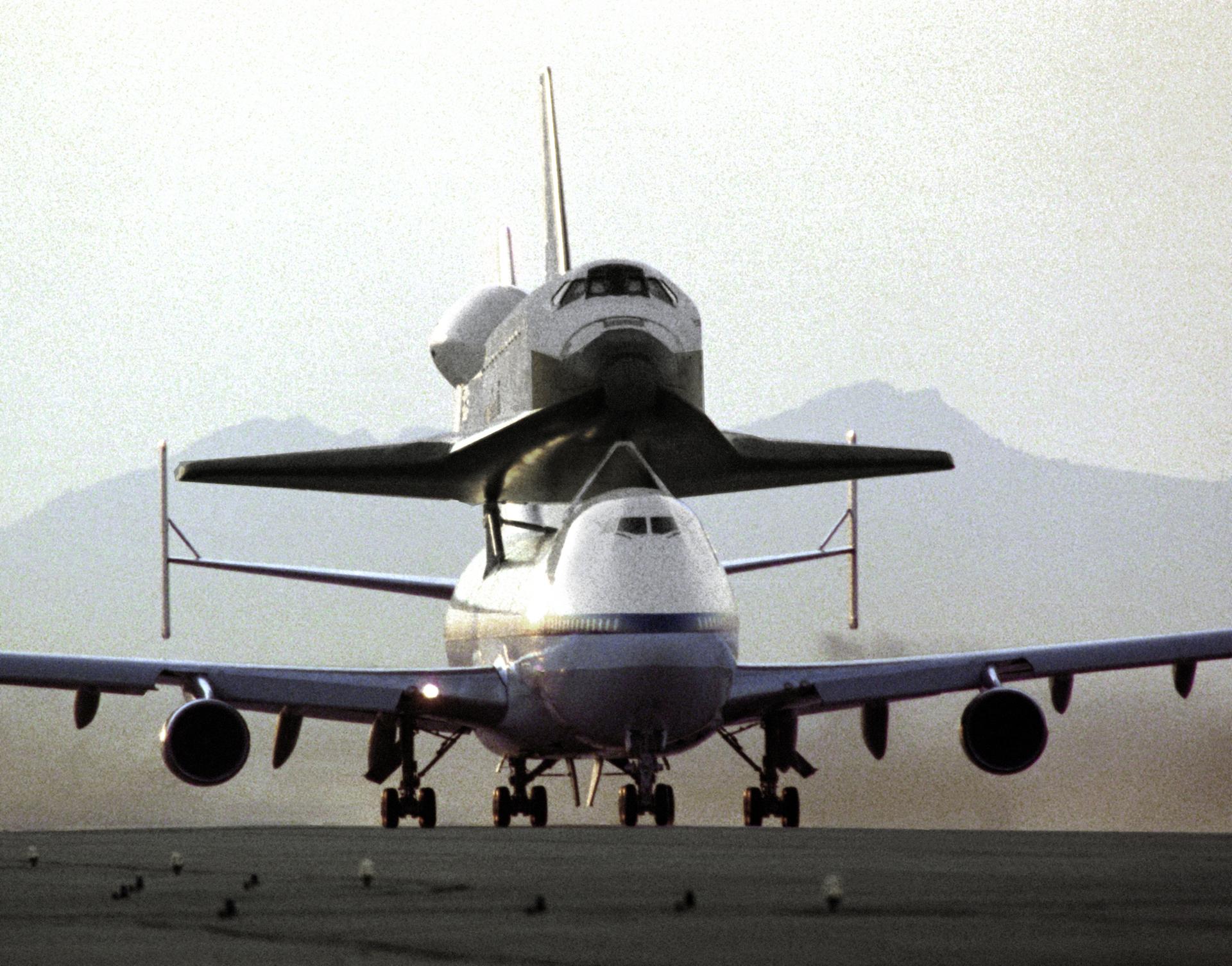 NASA's 747 Shuttle Carrier Aircraft No. 911, with the space shuttle orbiter Endeavour securely mounted atop its fuselage, taxies to the runway to begin the ferry flight from Rockwell's Plant 42 at Palmdale, California, where the orbiter was built, to the Kennedy Space Center, Florida. At Kennedy, the space vehicle was processed and launched on orbital mission STS-49, which landed at NASA's Ames-Dryden Flight Research Facility (later redesignated Dryden Flight Research Center), Edwards, California, 16 May 1992. NASA 911, the second modified 747 that went into service in November 1990, has special support struts atop the fuselage and internal strengthening to accommodate the added weight of the orbiters.