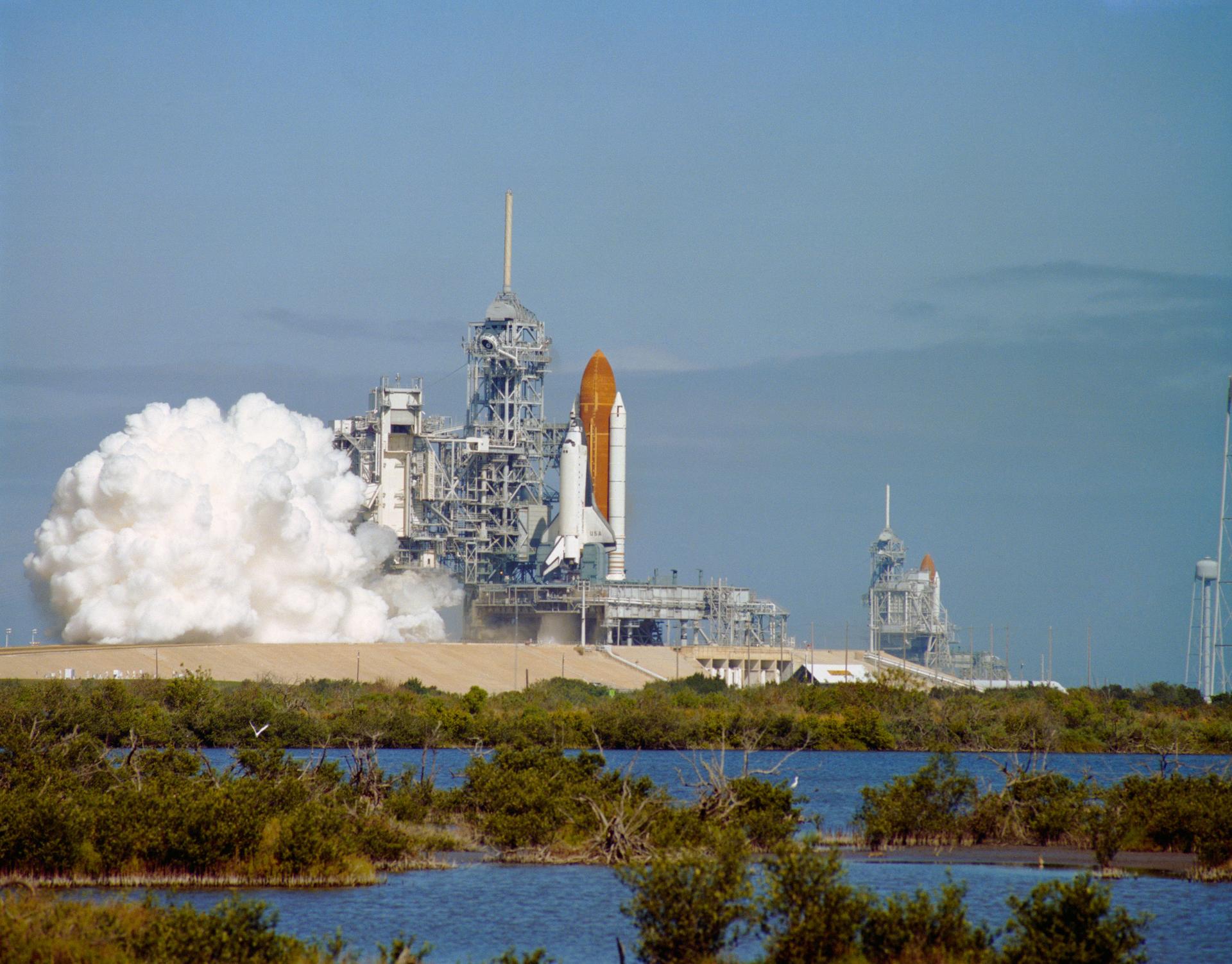 S93-31601 (March 1993) --- The second Space Shuttle launch attempt of 1993 comes to an abrupt halt when one of the three main engines on the orbiter Columbia shuts down at T -3 seconds, resulting in an on-the-pad abort of Mission STS-55. This was the first time in the post-Challenger era that a main engine shutdown has halted a Shuttle launch countdown, and only the third time in the history of the program. In 1984, STS-41D was scrubbed at T -4 seconds when the orbiter General Purpose Computer detected an anomaly in a main engine, and in 1985, STS-51F was halted at T -3 seconds due to a main engine malfunction that caused shutdown of all three engines. Columbia had been scheduled to lift off from Launch Pad 39B is the Space Shuttle Discovery, undergoing preparations for lift off on Mission STS-56.