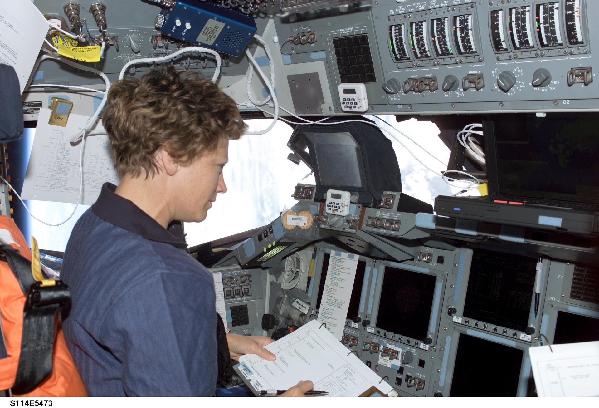 S114-E-05473 (28 July 2005) --- Astronaut Eileen M. Collins, commander, goes over a check list dealing with rendezvous and docking operations while seated at the commander's station onboard Discovery's crew cabin.