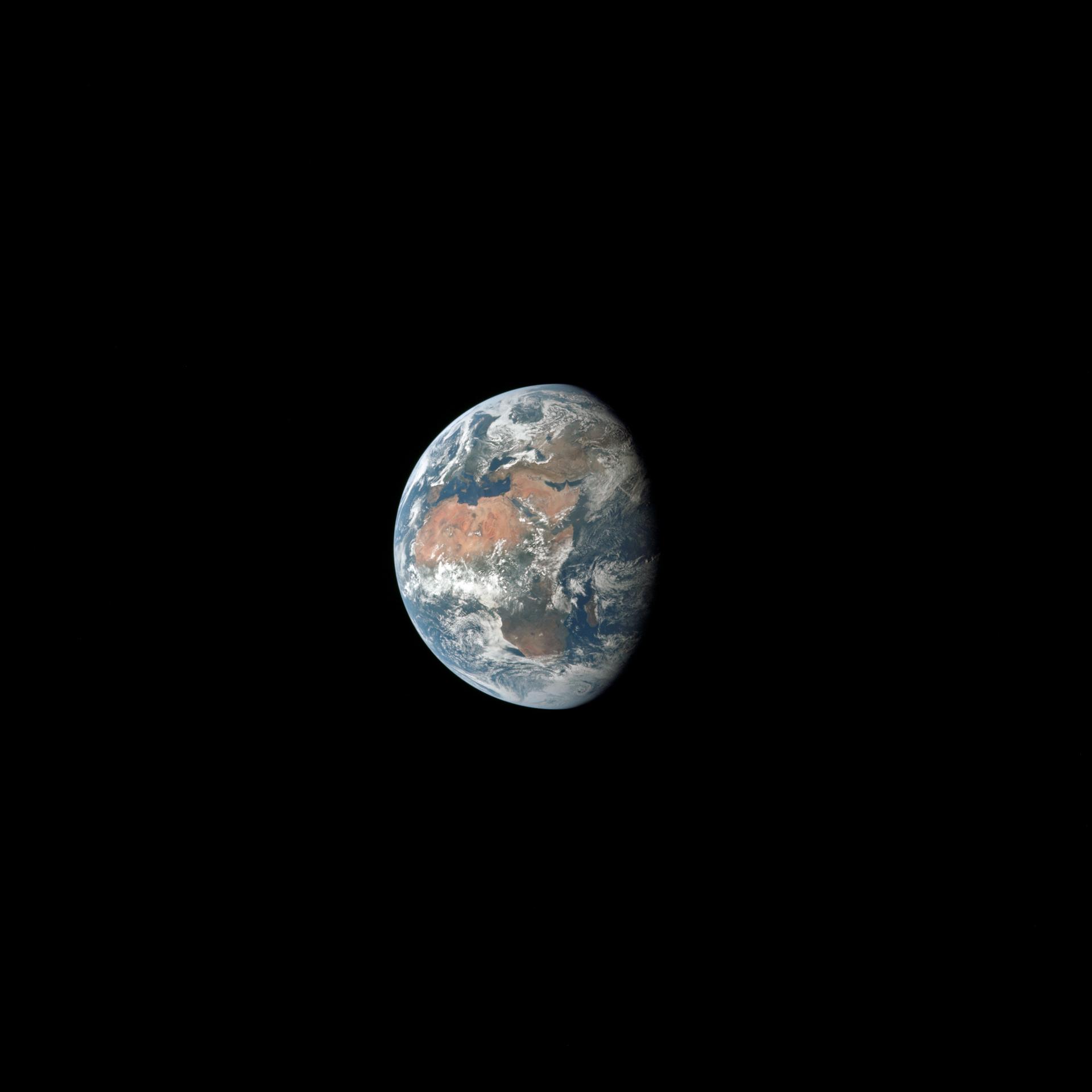 AS11-36-5355 (17 July 1969) --- Most of Africa and portions of Europe and Asia can be seen in this spectacular photograph taken from the Apollo 11 spacecraft during its trans-lunar coast toward the moon. Apollo 11, with astronauts Neil A. Armstrong, commander; Michael Collins, command module pilot; and Edwin E. Aldrin Jr., lunar module pilot, onboard was already 98,000 nautical miles from Earth when this picture was made. While astronauts Armstrong and Aldrin descended in the Lunar Module (LM) "Eagle" to explore the Sea of Tranquility region of the moon, astronaut Collins remained with the Command and Service Modules (CSM) "Columbia" in lunar orbit.