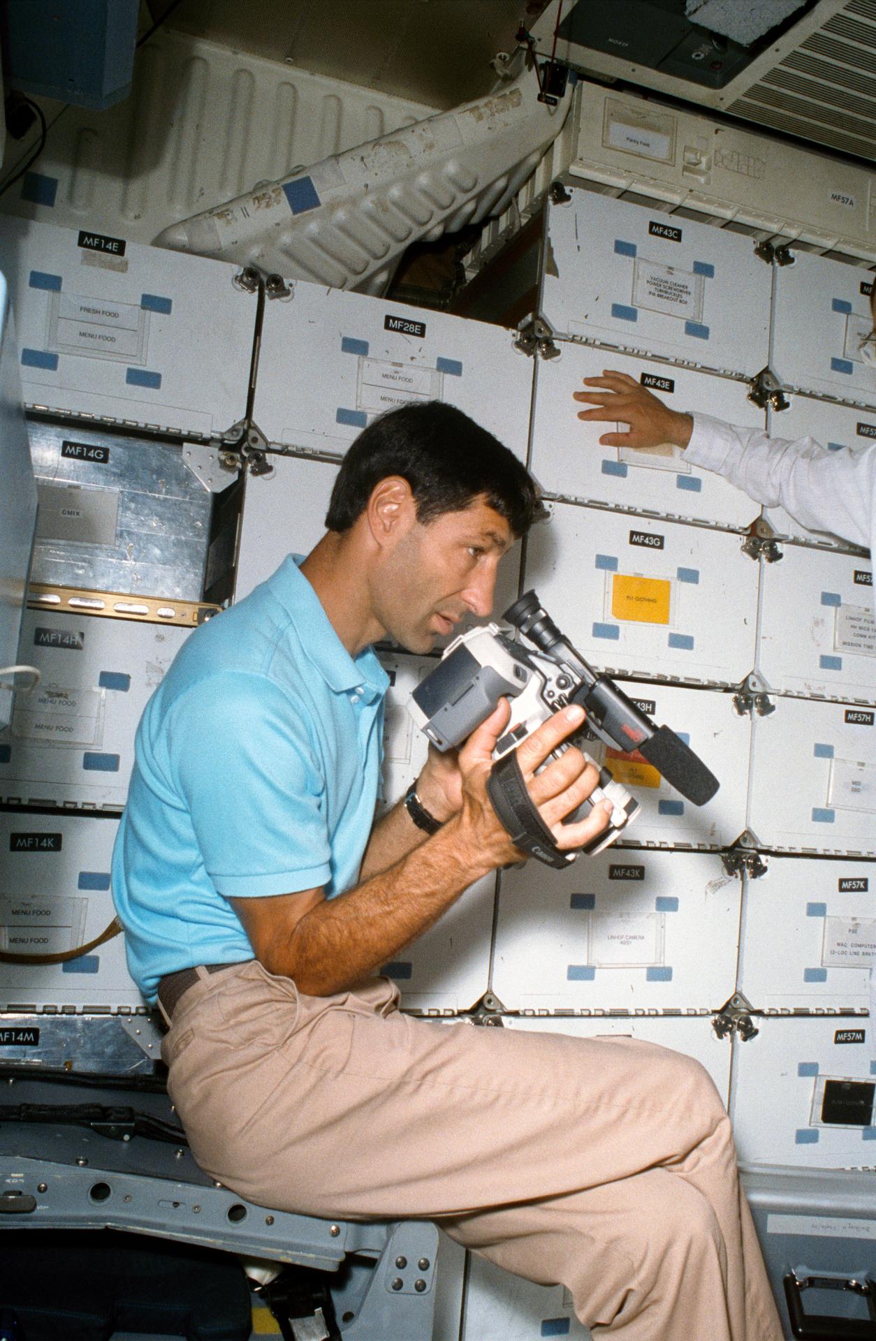 S92-45751 (1 Sept 1992) --- Astronaut Mario Runco Jr., mission specialist assigned to fly aboard the Space Shuttle Endeavour for the STS-54 mission, gets in some rehearsal time with a camcorder. He is on the middeck of a Shuttle trainer.