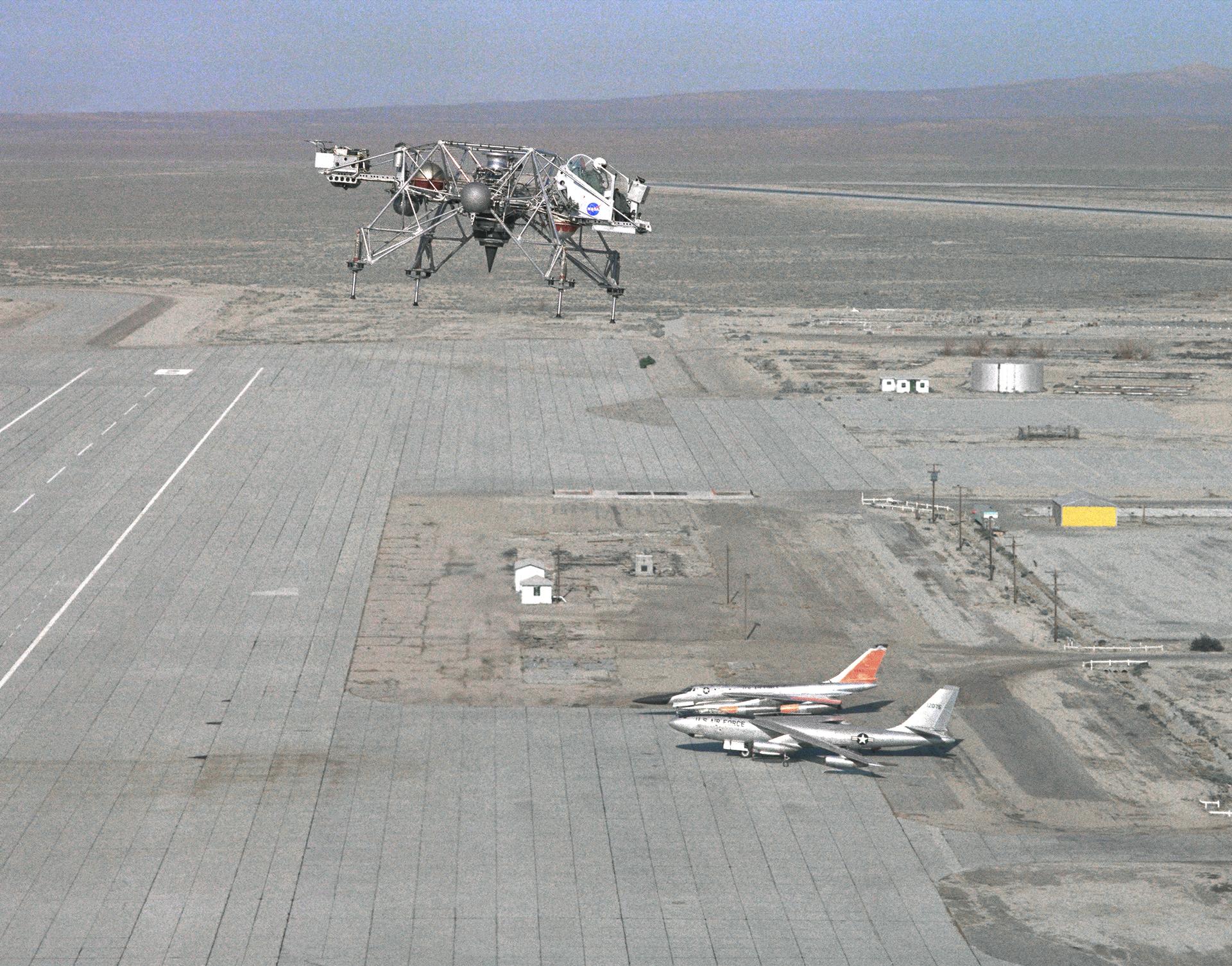 In this 1965 NASA Flight Reserch Center photograph the Lunar Landing Research Vehicle (LLRV) is shown at near maximum altitude over the south base at Edwards Air Force Base. When Apollo planning was underway in 1960, NASA was looking for a simulator to profile the descent to the moon's surface. Three concepts surfaced: an electronic simulator, a tethered device, and the ambitious Dryden contribution, a free-flying vehicle. All three became serious projects, but eventually the NASA Flight Research Center's (FRC) Landing Research Vehicle (LLRV) became the most significant one. Hubert M. Drake is credited with originating the idea, while Donald Bellman and Gene Matranga were senior engineers on the project, with Bellman, the project manager. Simultaneously, and independently, Bell Aerosystems Company, Buffalo, N.Y., a company with experience in vertical takeoff and landing (VTOL) aircraft, had conceived a similar free-flying simulator and proposed their concept to NASA headquarters. NASA Headquarters put FRC and Bell together to collaborate. The challenge was; to allow a pilot to make a vertical landing on Earth in a simulated moon environment, one sixth of the Earth's gravity and with totally transparent aerodynamic forces in a "free flight" vehicle with no tether forces acting on it. Built of tubular aluminum like a giant four-legged bedstead, the vehicle was to simulate a lunar landing profile from around 1500 feet to the moon's surface. To do this, the LLRV had a General Electric CF-700-2V turbofan engine mounted vertically in gimbals, with 4200 pounds of thrust. The engine, using JP-4 fuel, got the vehicle up to the test altitude and was then throttled back to support five-sixths of the vehicle's weight, simulating the reduced gravity of the moon. Two hydrogen-peroxide lift rockets with thrust that could be varied from 100 to 500 pounds handled the LLRV's rate of descent and horizontal translations. Sixteen smaller hydrogen-peroxide rockets, mounted in pairs, gav
