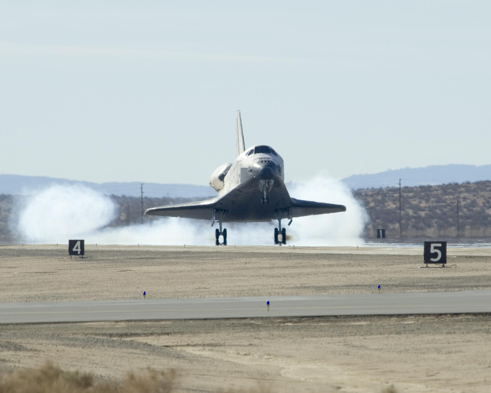 Smoke swirls as Space Shuttle Endeavour's tires strike the runway at Edwards Air Force Base Nov. 30 to conclude mission STS-126 to the International Space Station.
