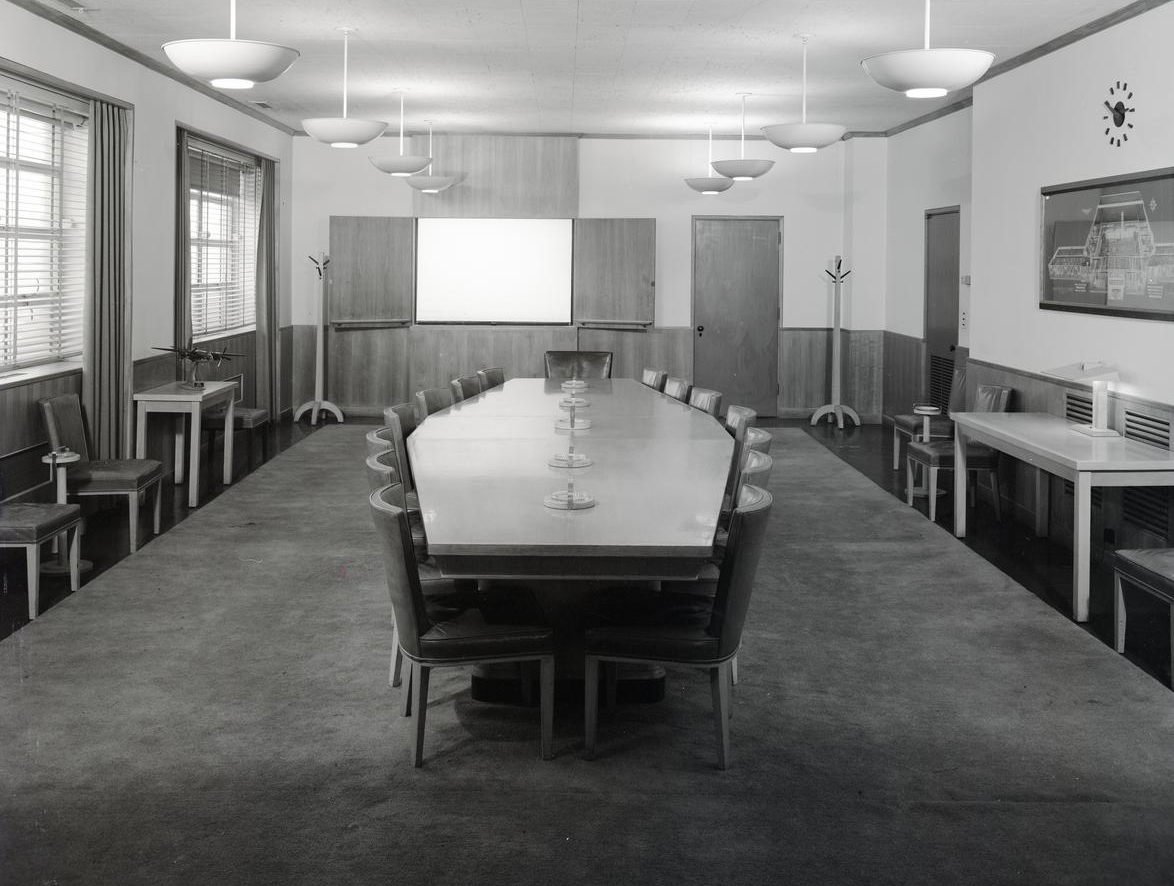 The northern corner of the Administration Building’s upper level was occupied by a 60-person conference room, referred to as the Committee Room. The rectangular room included three sets of windows along the front wall and another on the side wall and doorways to the hall and adjoining rooms. It featured the wood-panel wainscoting, in-wall clock, and suspended light fixtures common throughout the building. The room was dominated by a long, hexagonal wooden table.