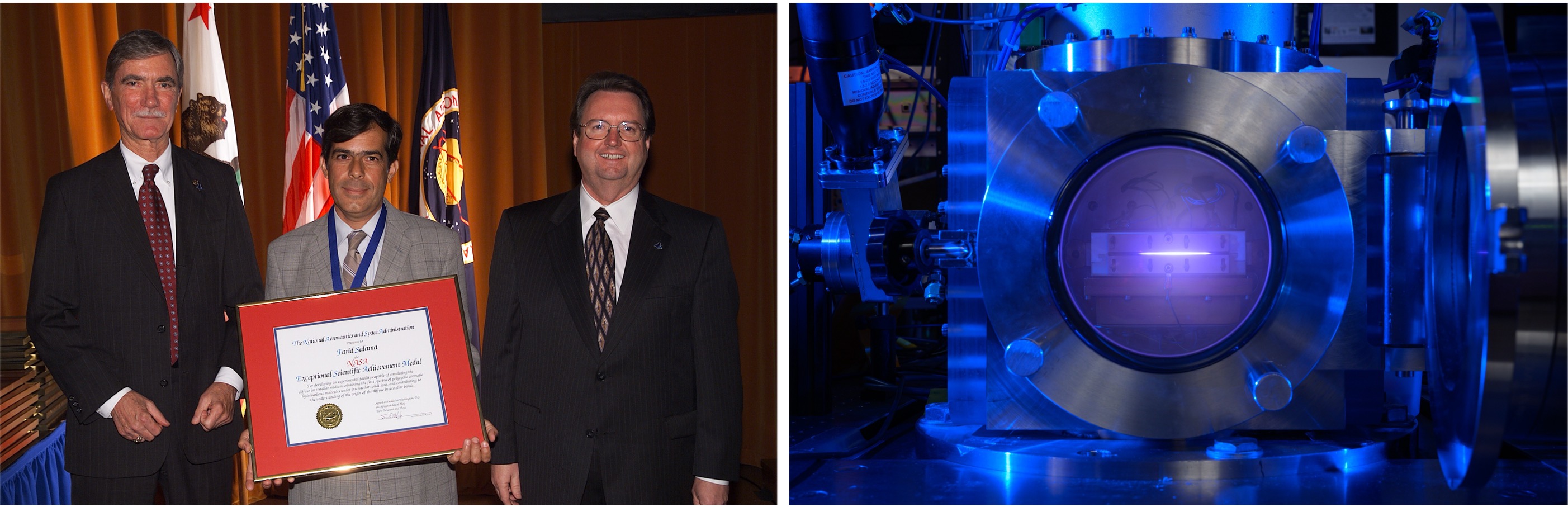 Left: In 2003, G. Scott Hubbard, NASA Ames Research Center’s director awarded Farid Salama the NASA Exceptional Achievement Medal for developing a unique experimental facility in laboratory astrophysics and for innovative research on diffuse interstellar bands. Right: A picture of the plasma produced in the COSmIC chamber to simulate astrophysical environments.