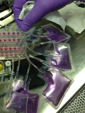 The central piece of the satellite is the experimental module. Bags containing nutrients and storing waste are connected to a microfluidics card, where samples of E. coli are stored in 48 small holes, each no bigger than a pencil eraser. The card is made of 18 plastic layers and is sandwiched between two heaters that control the temperature of the E. coli to ensure the experiment will be stable to one degree centigrade, or 1.8 degrees Fahrenheit.