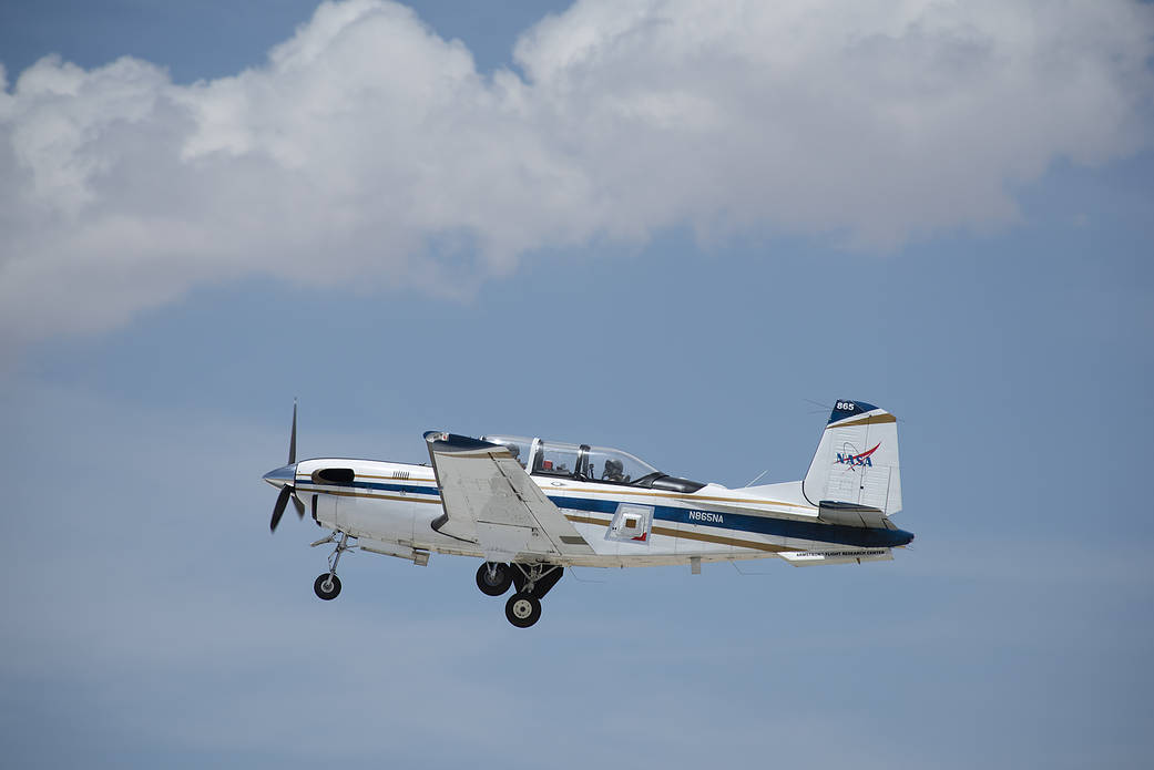 NASA Armstrong operates the Raytheon Aircraft Co. T-34C training plane for pilot proficiency and mission support. The aircraft accompanies research flights for photography and video data collection, and also as safety chase. At Armstrong, the T-34C is primarily used for chasing remotely piloted unmanned air vehicles that fly slower than NASA F-18 mission support aircraft can fly.