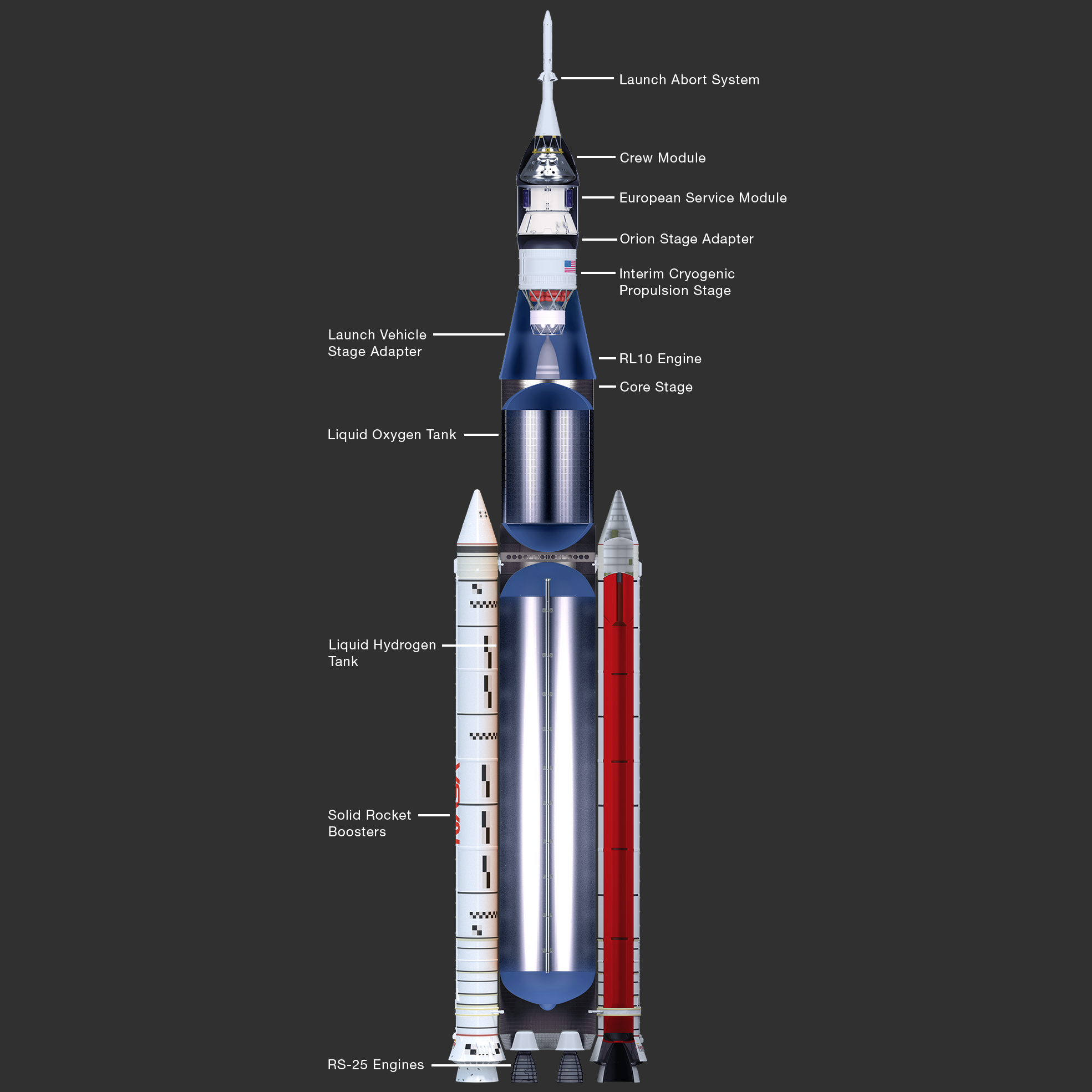 The SLS has two solid rocket boosters that burn approximately six tons of solid propellant each second to help lift the enormous rocket off the launch pad and send it soaring to space. Their job is finished in two minutes.