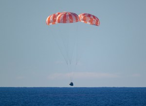 This image from April 10, 2026, captures NASA’s Orion spacecraft, with its parachutes deployed, seconds before splashdown in the Pacific Ocean. The Artemis II crew accomplished many milestones on their nearly 10-day mission, surpassing the Apollo 13 record for farthest…