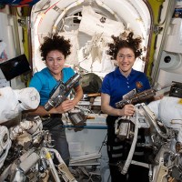 Commander Luca Parmitano of the European Space Agency (ESA) and NASA Flight Engineer Andrew Morgan will assist the spacewalkers. Parmitano will control the Canadarm2 robotics arm and Morgan will provide airlock and spacesuit support. All four astronauts gathered together today for a final procedures review.