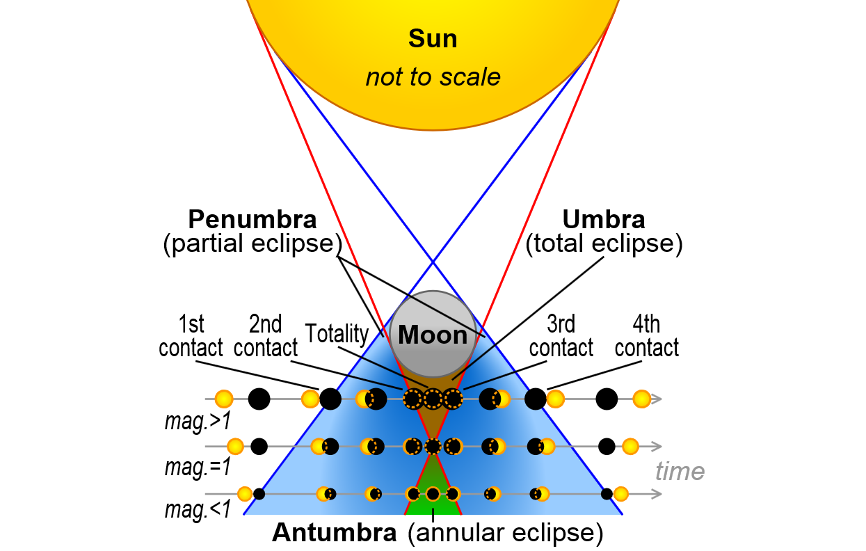 The physics of how each type of shadow is formed is difficult to explain but easy to visualize, so before I tell you about them, here is a picture (technically a ray diagram) of what happens during an eclipse: