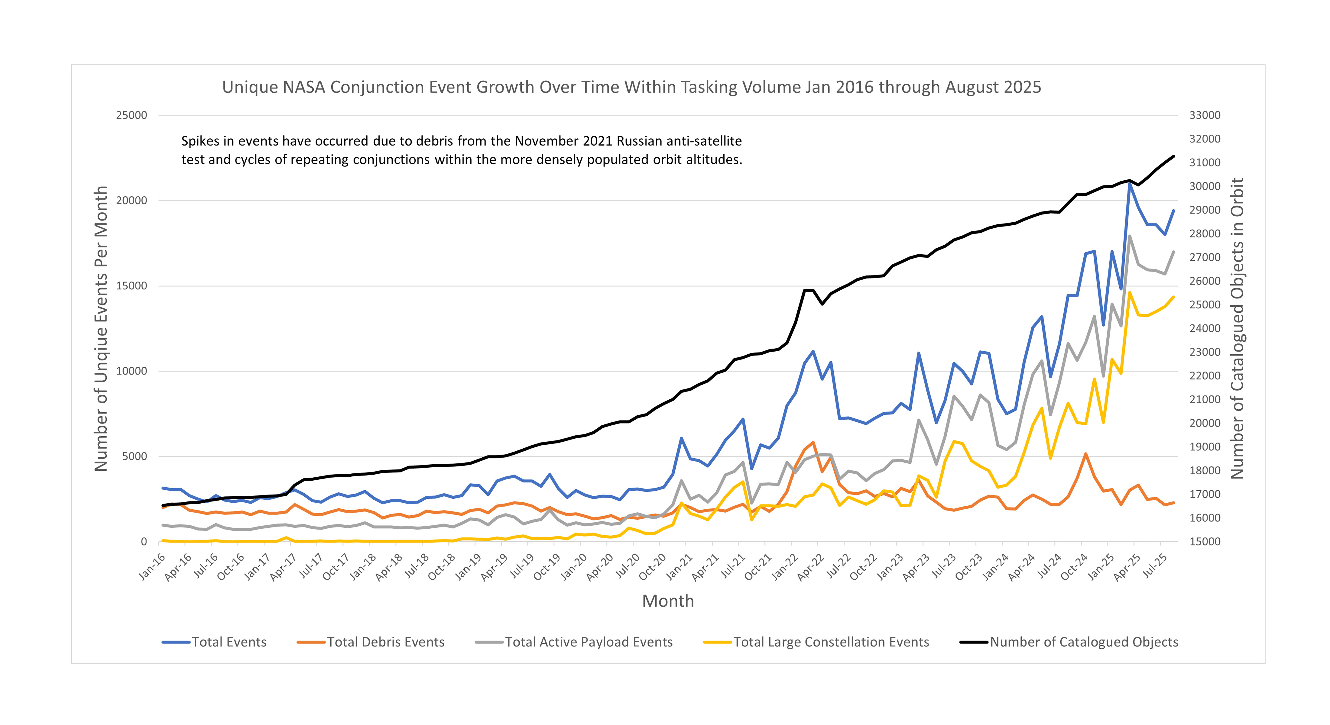 From 2016 to 2020 the number of events processed by the NASA CARA team remained relatively stable, with some discrete increases from month to month that cannot be attributed to any specific cause. Starting in 2020, there has been a large increase in events which can be attributed to more payloads launched into the orbit regimes populated by CARA assets in addition to debris-generating events. As events increase, so does the operational workload to identify and mitigate those events having a high probability of collision.