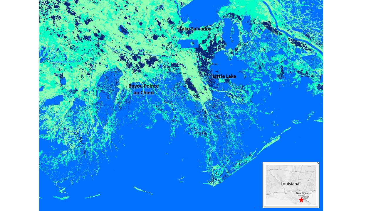 Map of wetland loss (dark blue pixels) across Barataria and Terrebonne Basins of coastal Louisiana detected by comparison of Landsat 8 NDWI images before and after the destructive storm surge of Hurricane Ida in August 2021. A total of 686 km² of wetland area was transformed to open water cover, more than twice the wetland area lost from Hurricane Katrina in 2005.