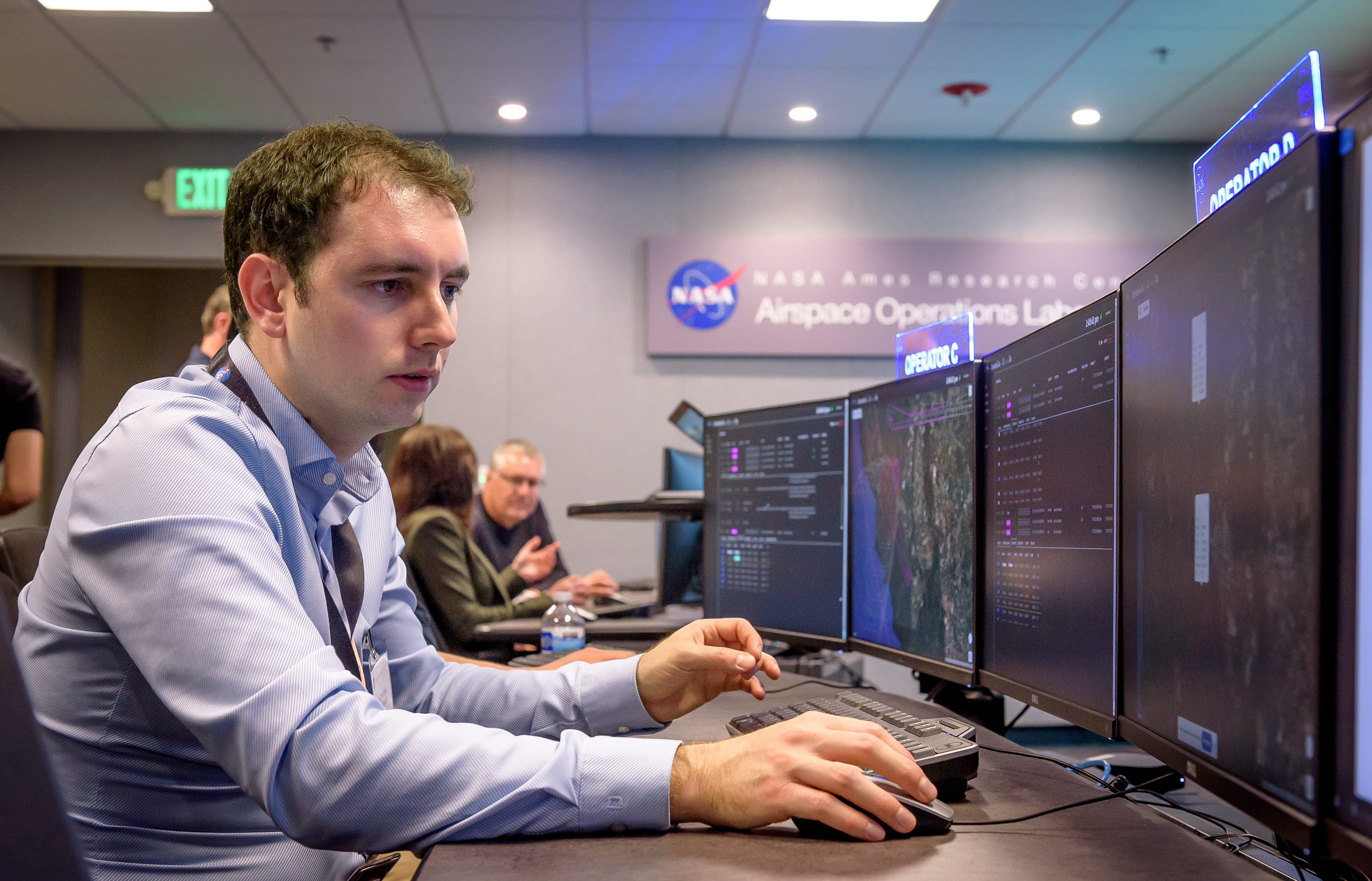 A NASA simulation of higher airspace traffic management with industry partners Aerostar and Sceye in the Airspace Operations Laboratory at NASA’s Ames Research Center in California’s Silicon Valley on July 29, 2025.
