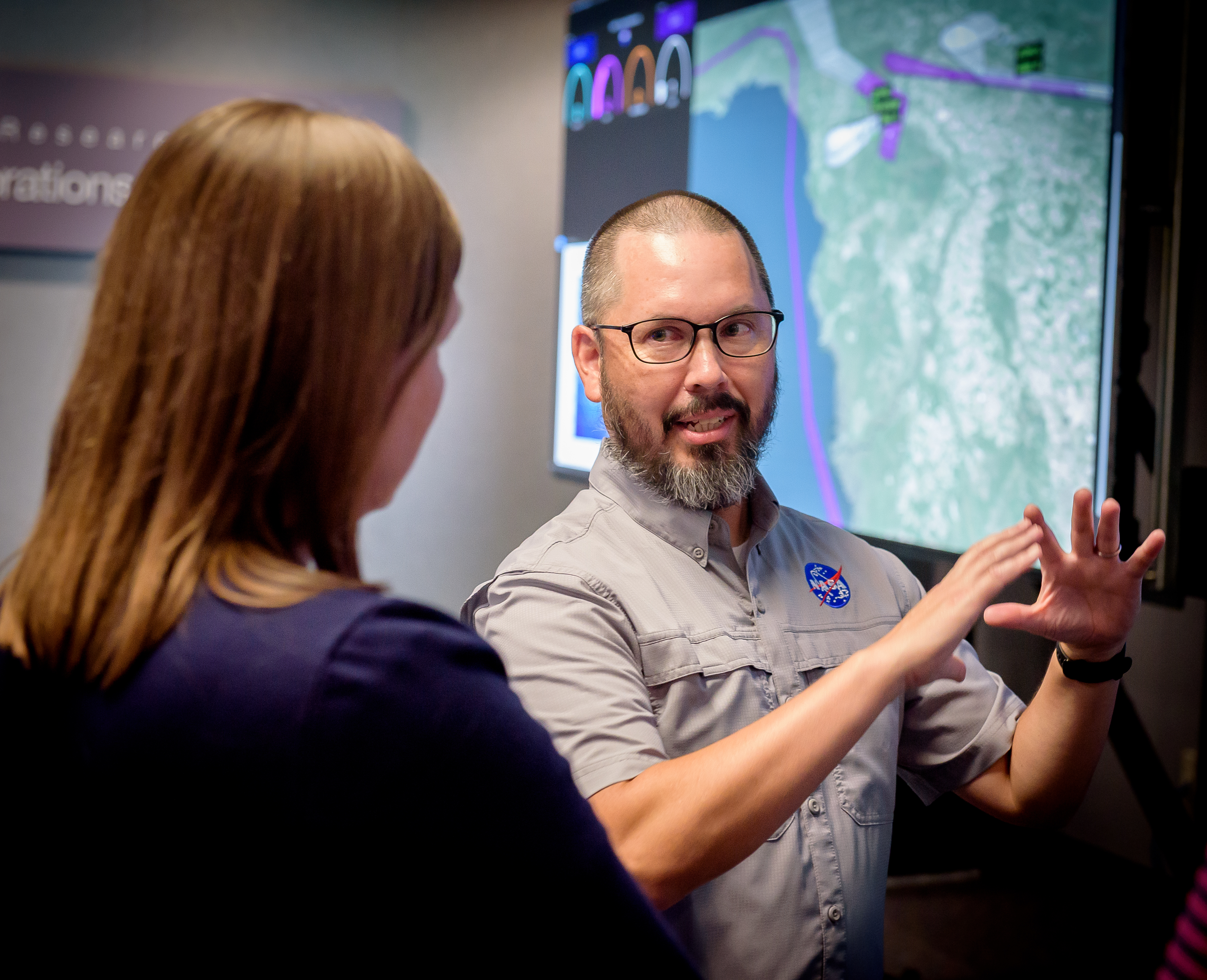 NASA researchers Heather Arneson and Jeff Homola discuss the high-altitude air traffic simulation in the agency’s Airspace Operations Lab at NASA Ames on July 29, 2025.