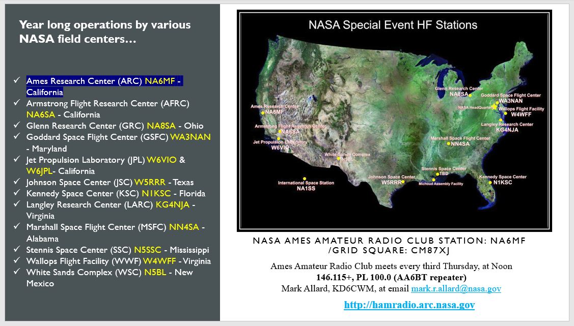 Upcoming “NASA on the Air” Events/Milestones coming up this year, will include: