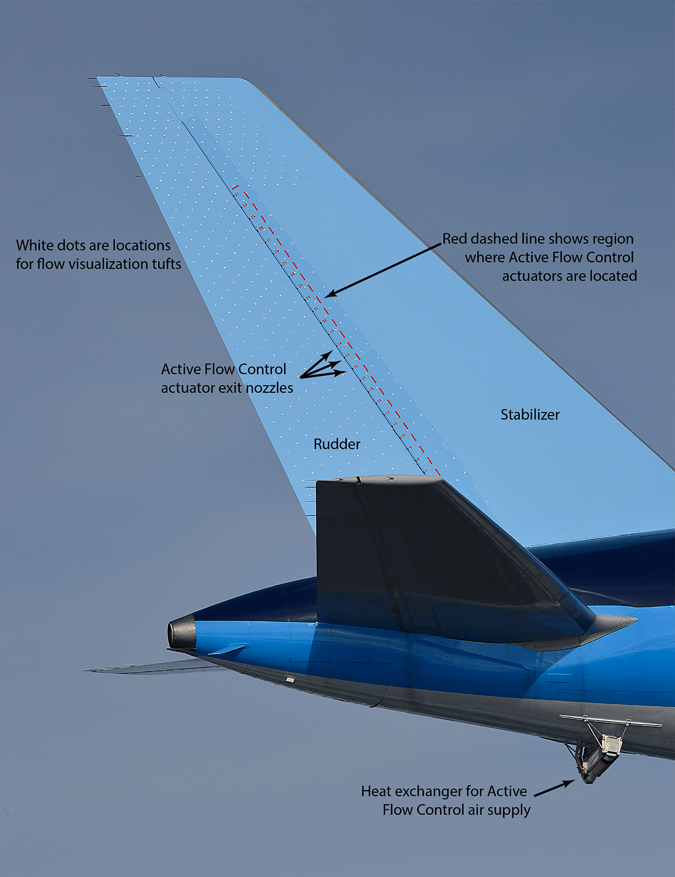 Tail of an airplane, showing Active Flow Control actuators, Flow Visualization Tufts, rudder, stabilizer and air supply.