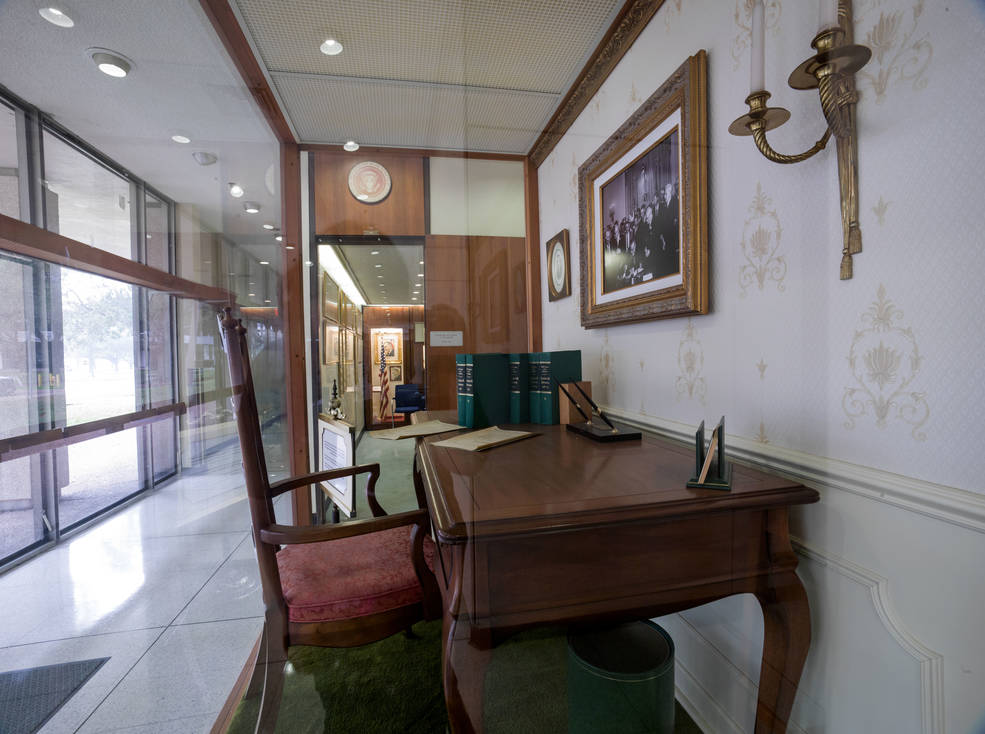 Three views of the Lyndon Baines Johnson Room, adjacent to the auditorium, displaying the President’s chair and desk and other memorabilia from his presidency.