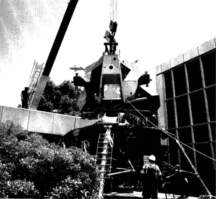 Left: Workers move the Lunar Landing Training Vehicle (LLTV) into the Teague Auditorium lobby in July 1989 in time for the Apollo 11 20th anniversary celebration. Middle: Workers remove the LTA-8 from the lobby in May 1992 for the move to Space Center Houston. Right: Workers raise the LLTV to suspend it from the lobby ceiling in November 1993.