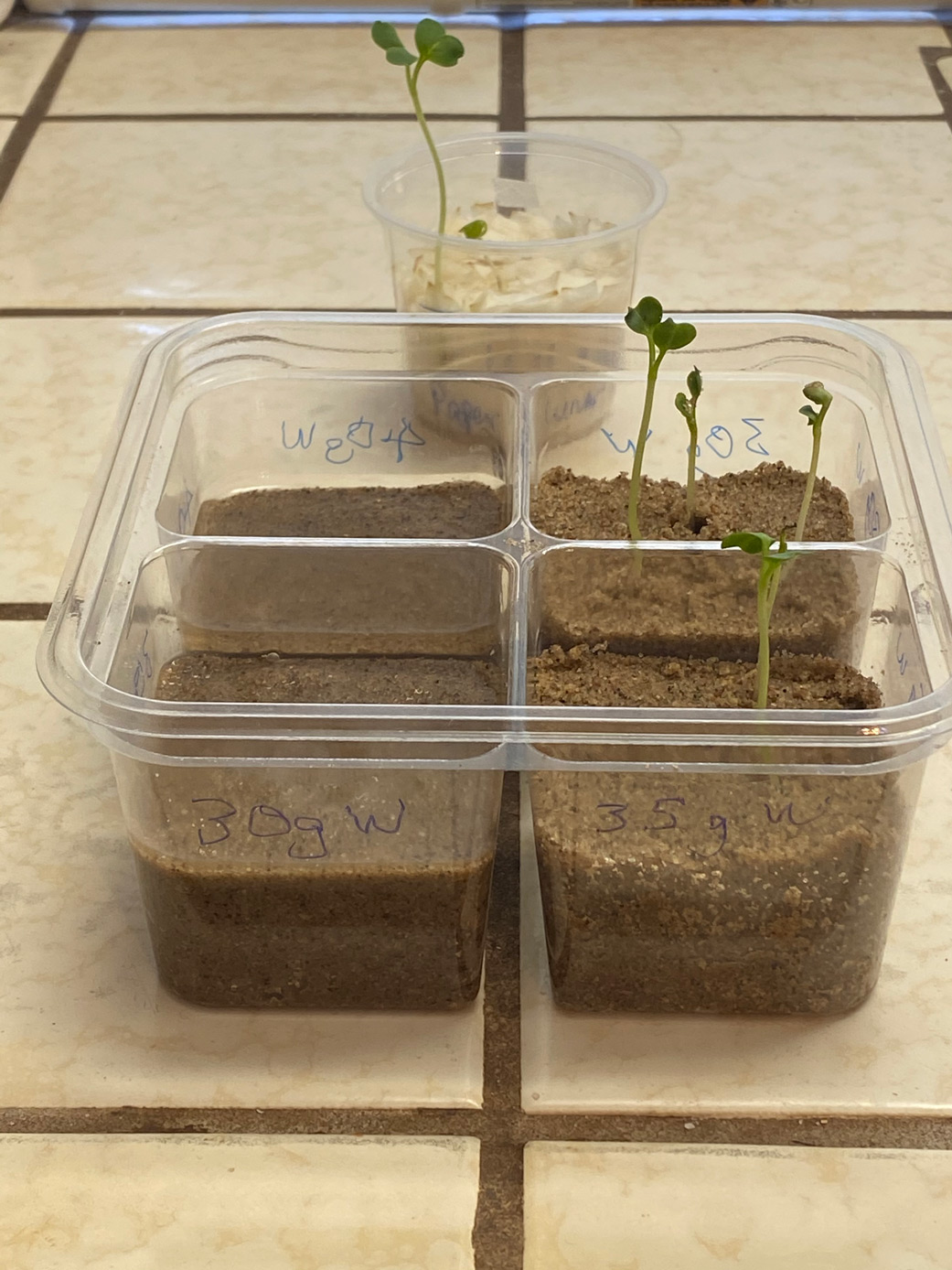 Coleman started his first radish experiment by cutting paper towels into small squares, adding water, stuffing them into a container, then tucking in three radish seeds at a depth of half an inch. Only one sprouted – apparently the one that somehow got enough oxygen to germinate. Once the sand arrived, Coleman ditched the paper towels and started using it in a four-compartment deli container.