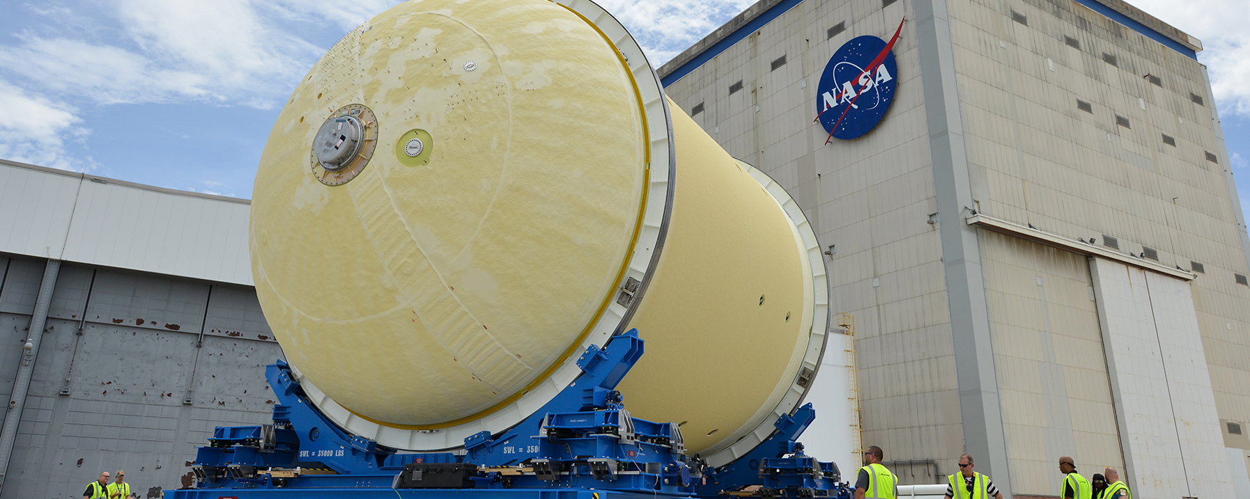 An innovative robotic system at NASA’s Michoud Assemby Facility sprayed thermal protection foam on the tank that will hold the cryogenic liquid oxygen propellant for Exploration Mission-1 (EM-1), the first integrated flight of NASA’s Space Launch System and the Orion spacecraft. This week, the massive tank was moved to install sensors and prepare it to be stacked with the intertank and forward skirt to form half of the 212-foot-tall rocket core stage.