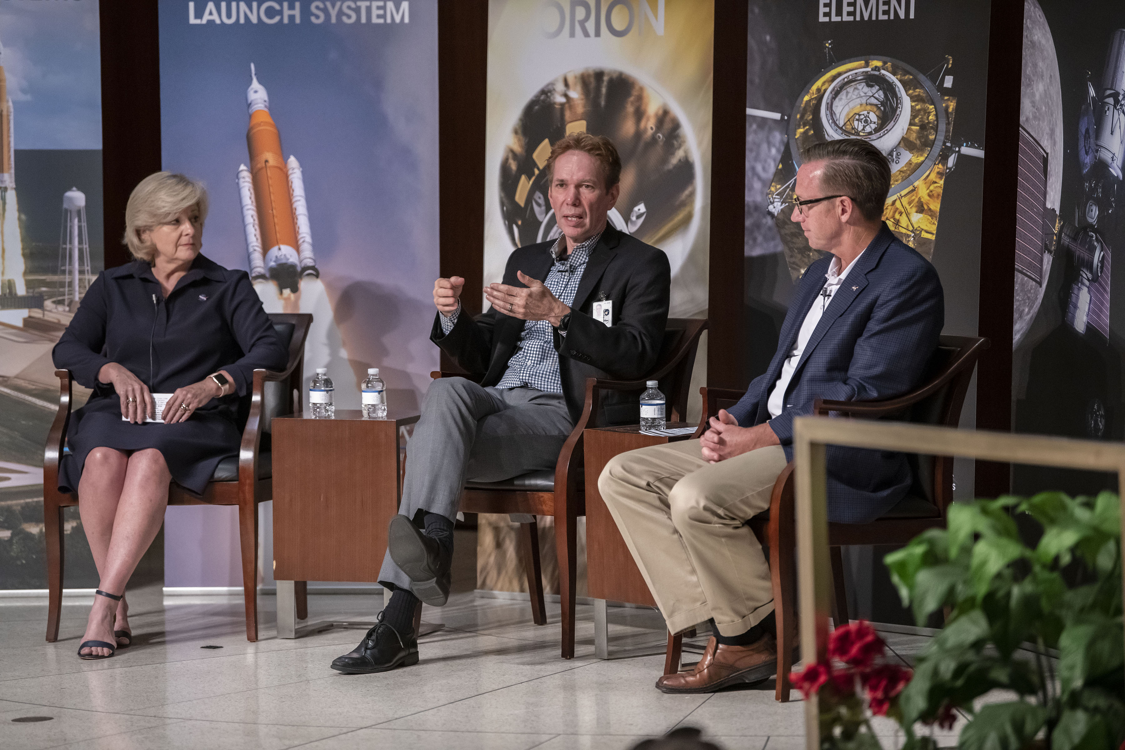 Marshall Deputy Director Paul McConnaughey, center, answers a question from a Marshall team member during a Q&A session with Singer, left, and Marshall Associate Director Steve Miley. (NASA/Fred Deaton)