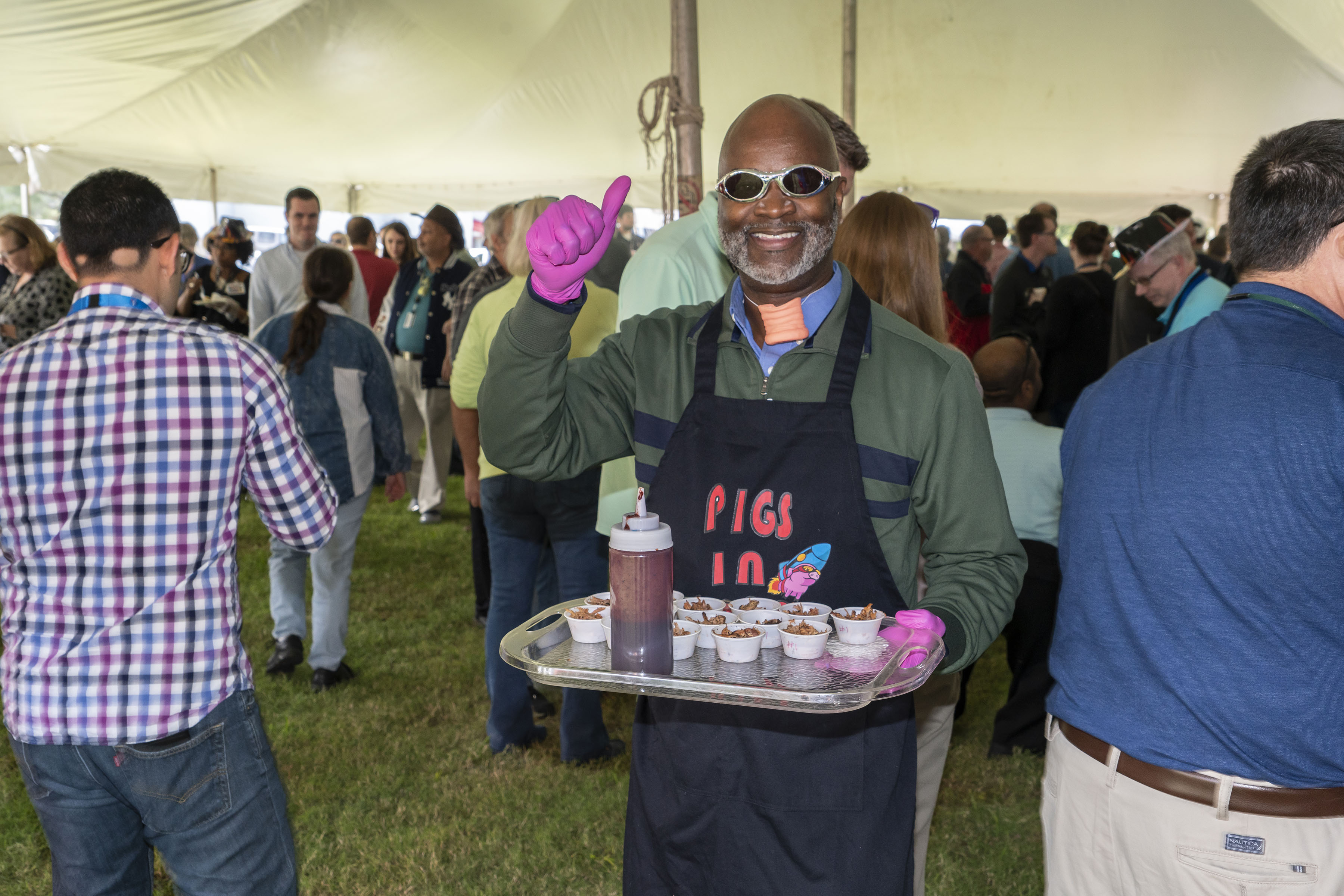 Larry Mack, deputy director of the Office of Human Capital at NASA’s Marshall Space Flight Center, hands out barbecue samples during the “2018 Fall Festival” social sponsored by the Marshall Exchange Oct. 18. (NASA/Fred Deaton)