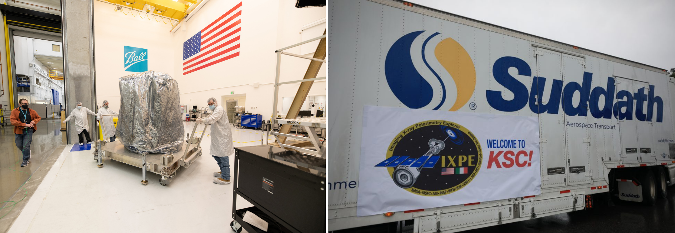 Left: Workers at Ball Aerospace in Boulder, Colorado, prepare to ship NASA’s Imaging X-Ray Polarimetry Explorer (IXPE) spacecraft. Right: IXPE arrives at Cape Canaveral Space Force Station in Florida on Nov. 5. IXPE will study the polarization of X-rays coming to Earth from some of the universe’s most extreme sources – including black holes and dead stars known as pulsars. NASA’s first mission dedicated to measuring X-ray polarization, IXPE is scheduled to launch aboard a SpaceX Falcon 9 vehicle from Kennedy Space Center’s Launch Complex 39A on Dec. 9. The launch is managed by NASA’s Launch Services Program, based at Kennedy. Final prelaunch testing of IXPE began Nov. 8. The spacecraft is expected to be mated to the rocket during the last week of November. IXPE will fly three space telescopes with sensitive detectors capable of measuring the polarization of cosmic X-rays, allowing scientists to answer fundamental questions about these extremely complex environments where gravitational, electric, and magnetic fields are at their limits. NASA selected IXPE as an Explorers Program mission in 2017. The IXPE project is a collaboration between NASA and the Italian Space Agency. NASA’s Marshall Space Flight Center manages the IXPE mission. Ball Aerospace, headquartered in Broomfield, Colorado, manages spacecraft operations with support from the University of Colorado at Boulder. NASA’s Goddard Space Flight Center manages the Explorers Program for the agency’s Science Mission Directorate. (Ball Aerospace, NASA/Isaac Watson)