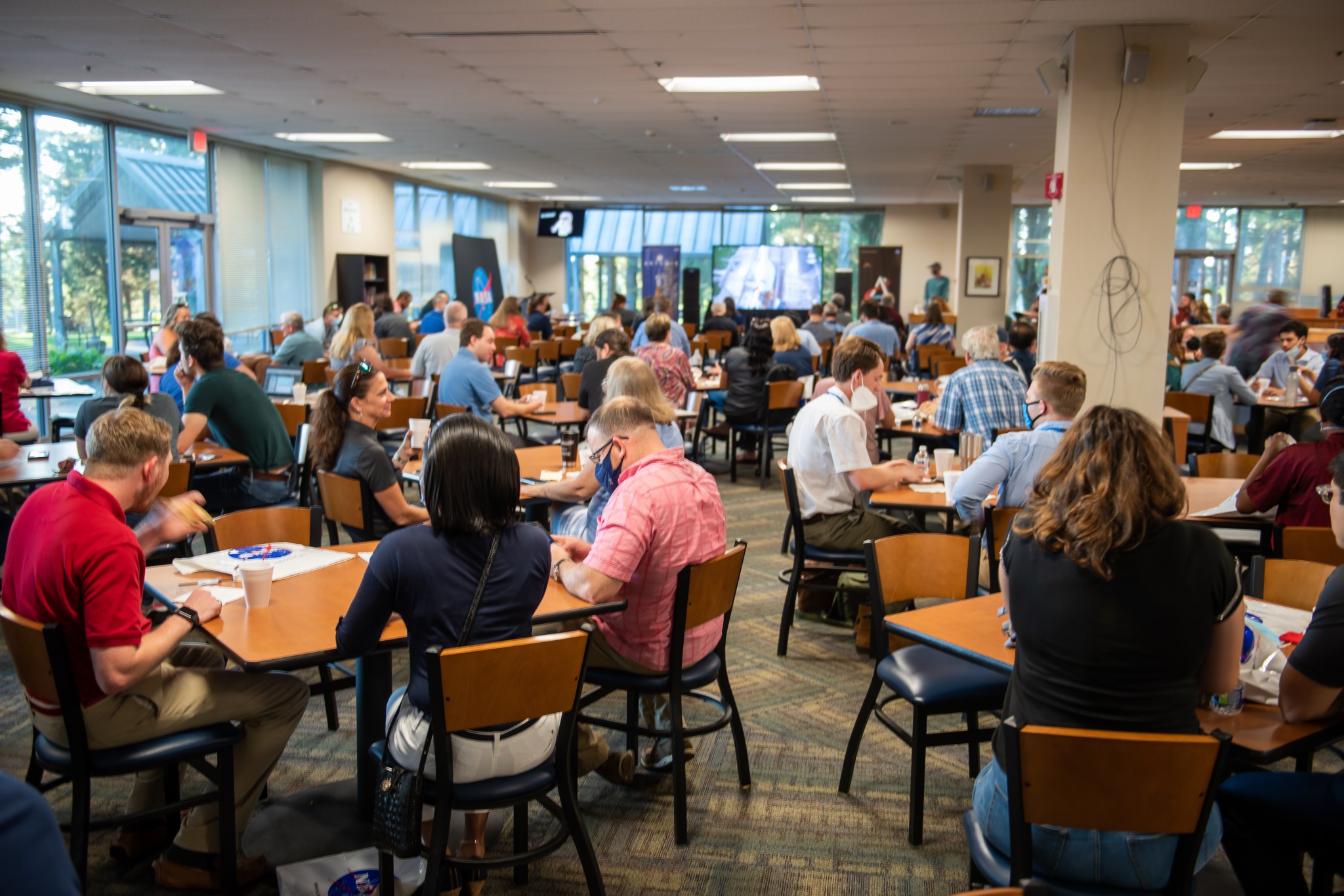 Team members at NASA’s Marshall Space Flight Center gather Aug. 29 for an Artemis I launch watch party in the 4203 cafeteria. Following the scrub of the Aug. 29 attempt, NASA set a two-hour launch window for Sept. 3 beginning at 1:17 p.m. CDT. The Artemis I flight test is the first integrated test of the agency’s deep space exploration systems: the Orion spacecraft, SLS rocket, and supporting ground systems. (NASA/Alex Russell)