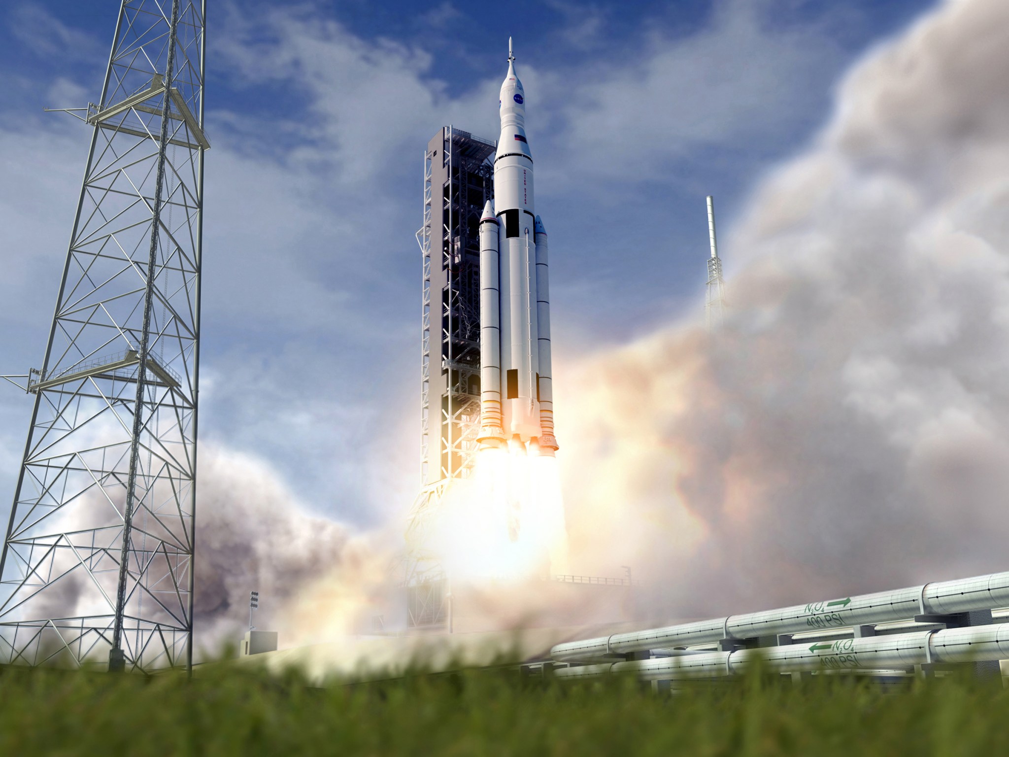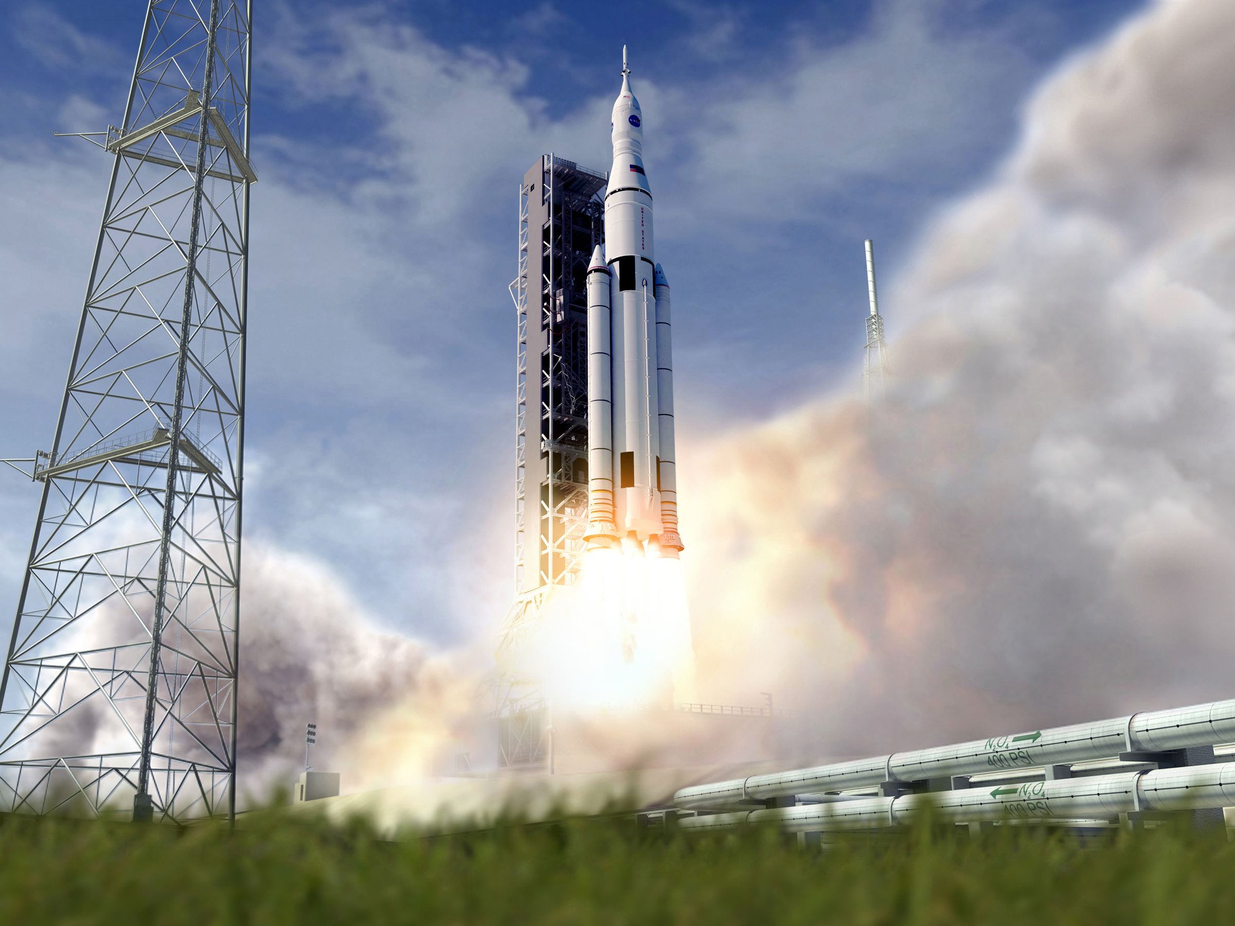 Artist’s concept of NASA’s Space Launch System initial crew vehicle launching from the Kennedy Space Center.
