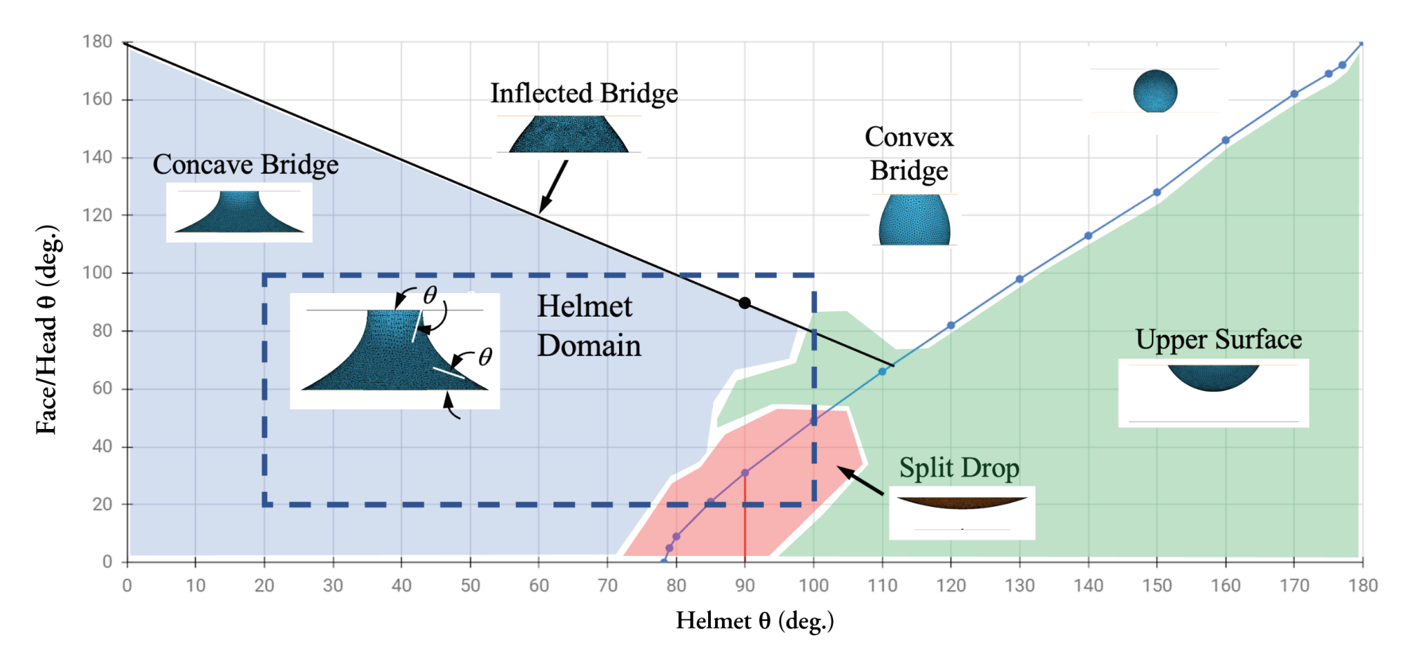 During EVA22 in 2013, water was observed in the helmet and assumed to be the result of a “burp” from the drink bag. No further investigation was pursued because water had been observed to some degree (water on visor, wet hair, etc.) on eight previous occasions. The result was a nearly catastrophic event during EVA23, where astronaut Luca Parmitano experienced dangerous quantities of water in his helmet. Both EVA23 and EVA35 in 2016 contributed to identification of drowning as a key risk, which resulted in several water mitigation approaches. Based on these approaches, the program determined the risk level to be acceptable for nominal EVA. However, in March 2022, a crewmember returning from EVA80 noticed water accumulated on the visor of his helmet obstructing ~30-50% of his field of view. Due to the increasing complexity of EVA objectives on EVA80 and forward, the ISS Program identified loss or reduction of visibility as a greater risk than previously recognized and sought to identify methods to prevent even small quantities of liquid water from forming in the helmet during EVA. The NESC was asked to provide support to the activity through modeling of the helmet and two-phase (water and oxygen) flow behavior in microgravity, through model validation testing, and through testing of mitigation hardware identified by the larger team. The model predictions provided a map (Figure 1) of anticipated liquid water formations based on the contact angle between the face or head and the helmet surface. Based on the ISS helmet with no water mitigations, the model predicted that large blobs would most likely form bridges between the helmet and face and that rupture of those bridges would result in the majority of liquid transferring to the face. To mitigate this risk, the ISS EVA80 team devised a solution to add absorbent materials in the path of the oxygen and water entering the helmet. Following EVA23, the helmet absorption pad (HAP) was added for bulk water collection. The improved mitigation strategy based on EVA80 included a HAP extender (HAP-E) and a helmet absorption band (HAB) (Figure 2). The NESC provided modeling of the mitigation hardware and validation testing of the HAB configuration using flow conditions anticipated in ISS operation (Figure 3). The testing provided ground validation of the HAB performance. The HAB and HAP-E have both been implemented in flight.