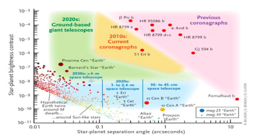Several planets or “planetary-mass objects” have already been directly imaged with coronagraphs from space and from the ground as shown in the right-hand corner of Figure 3.5.