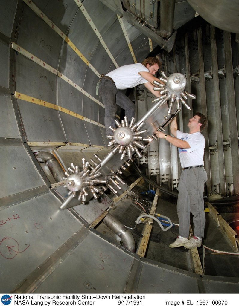 The National Transonic Facility is a high-pressure, cryogenic, closed-circuit wind tunnel that uses supercold nitrogen gas at high pressure to duplicate true flight aerodynamics. The NTF can accommodate models as small as one-fiftieth the size of an actual aircraft.