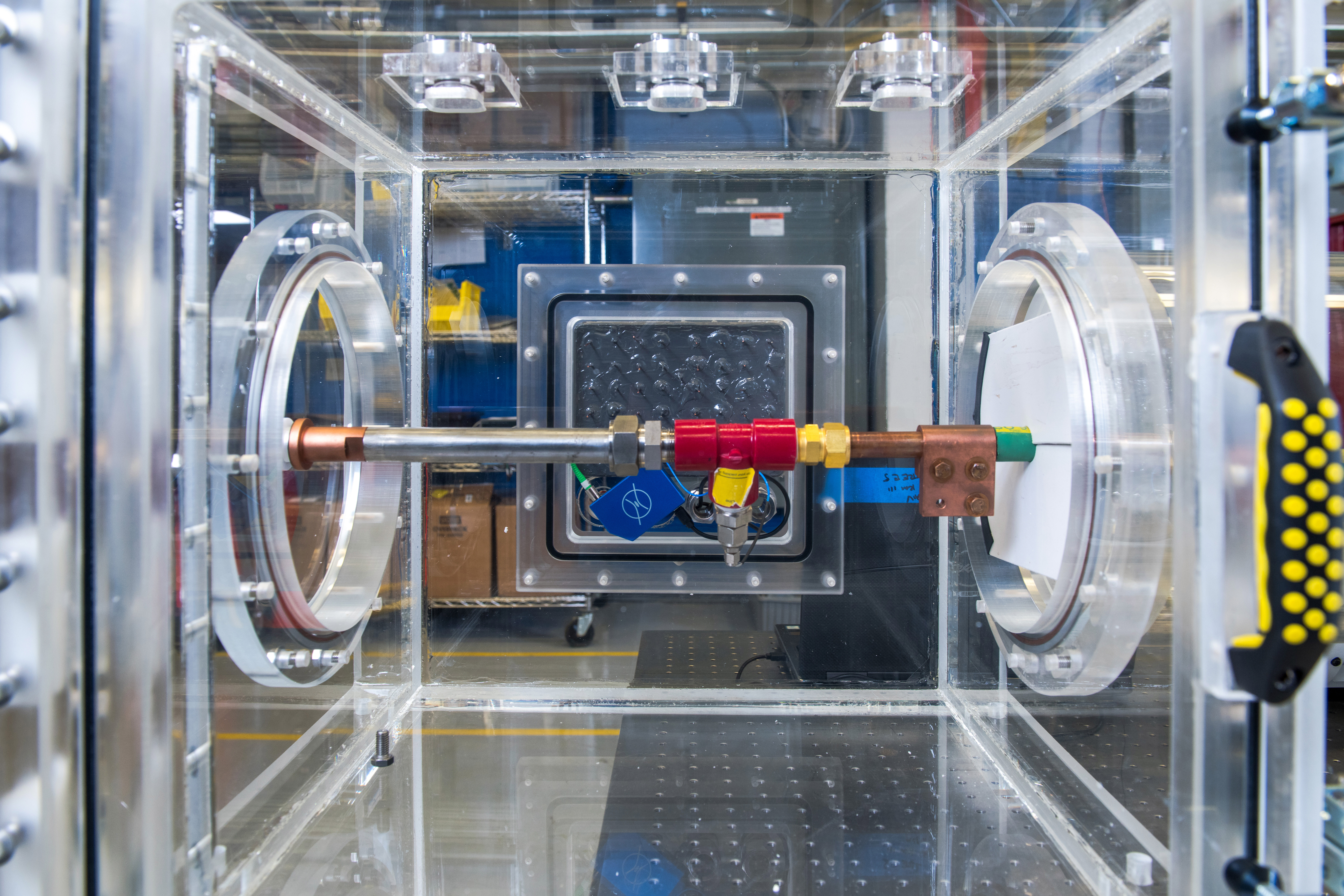 The lab’s acrylic high-voltage test chamber is used to evaluate cables and connectors under low-atmospheric conditions at a simulated altitude of up to 60,000 feet above sea level at voltages up to 6 kV, or 6,000 volts. The acrylic chamber is also built to be non-conductive, minimizing the amount of heat, electricity, or sound that passes through. This enables researchers to study partial discharge and other high-voltage effects without interference from metal walls or grounded surfaces that could potentially affect measurements and general cable performance.