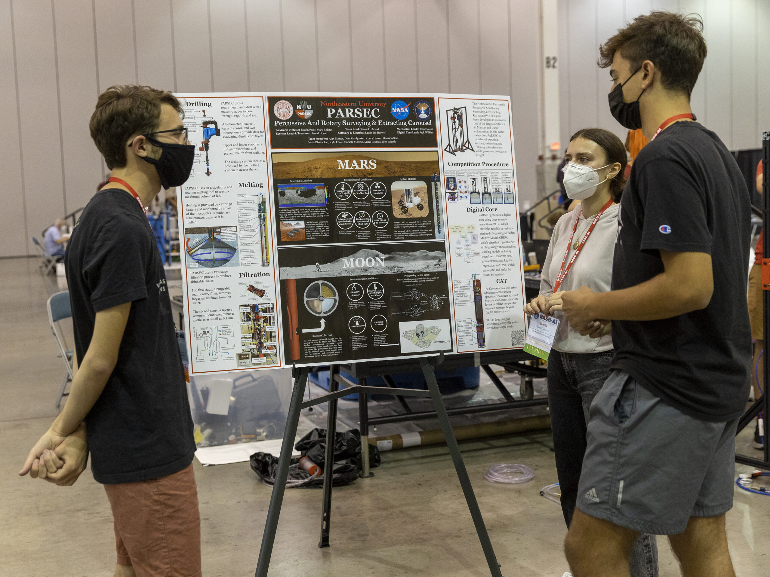 Planning a competition like this, however, is no small feat—enter SMAB engineer Chris Jones and Shelley Spears, the Director of Education and Outreach at the National Institute of Aerospace (NIA) and principal investigator for MMIP. Spears works very closely with NASA and industry experts to develop and execute the RASC-AL competition. She focuses on what the industry would find most helpful to advance the technology for harvesting ice to process into water on the Moon and Mars and translates that into a real competition. Jones serves as a member of the steering committee, which helps set the context of the challenge, reviews proposals submitted by the university teams, and selects the designs that seem most promising. During the competition, Jones also serves as a judge, evaluating the final papers and posters submitted by the teams alongside the hardware they designed.