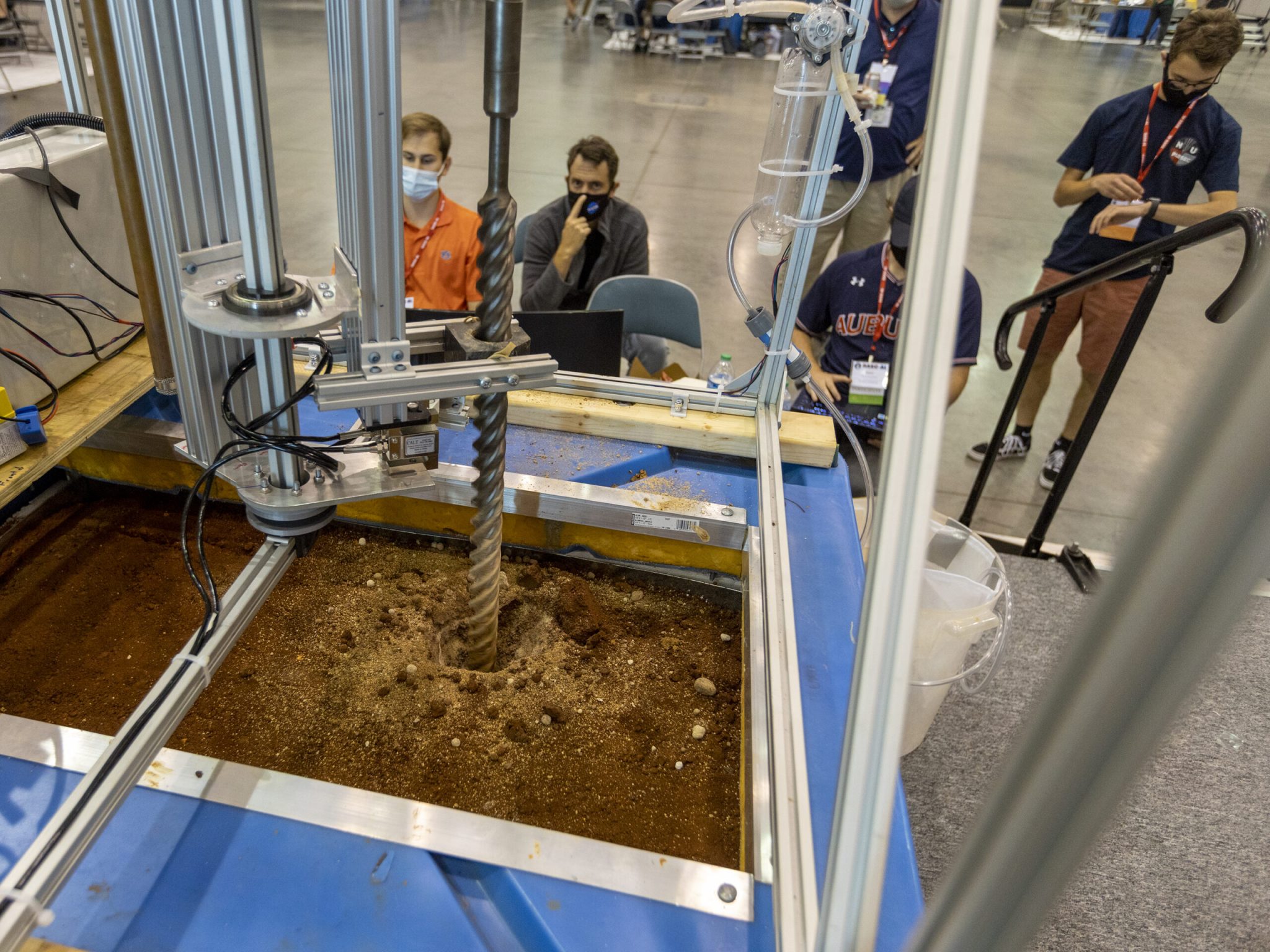 Since its conception, MMIP has been a labor of love, filled with days of hard work, triumphs, and low points. Spears recalls that the first year of the competition required a lot of elbow grease. One of the biggest challenges was designing a testbed that would best simulate drilling on the surface of Mars. She scouted gravel yards and supply stores, picking out bags of rocks and clay to find the right combination to mimic NASA’s current understanding of Martian regolith. Creating the ideal testbed also required keeping it cold. One of the team members, an educator-in-residence from Hampton City Schools, who also happened to be a fisherman, suggested looking into commercial fishing coolers. This idea ended up being the perfect solution, supporting the thousand pounds of ice and regolith simulant while maintaining its frozen state in the Virginia summer heat. Spears commented when planning a competition like this, “It takes a lot of different kinds of people on a team to come up with good solutions.”