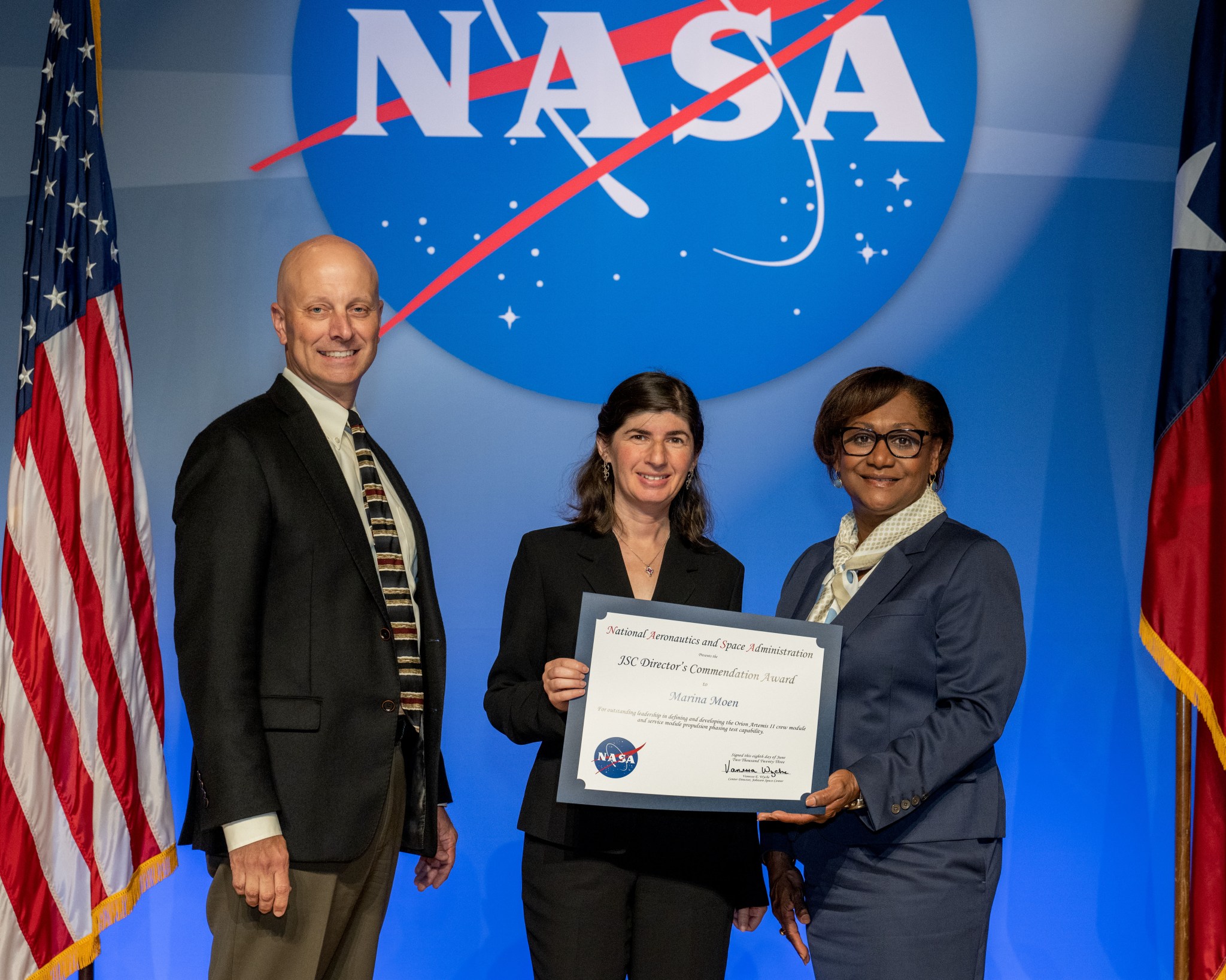 One of NASA Langley’s engineers is a recipient of Johnson Space Center’s (JSC) Director’s Commendation Award for 2022. Marina Moen, a flight mechanics engineer with the Vehicle Analysis Branch (VAB) of the Systems Analysis and Concepts Directorate, was honored during a ceremony at JSC June 8.
