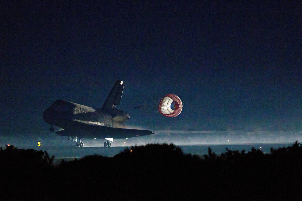Left: Space shuttle Atlantis makes a night landing at NASA’s Kennedy Space Center in Florida to end the STS-135 mission and the space shuttle program. Right: STS-135 astronauts Christopher J. Ferguson, left, Sandra H. Magnus, Douglas G. Hurley, and Rex J. Walheim stand in front of Atlantis following their return from space.