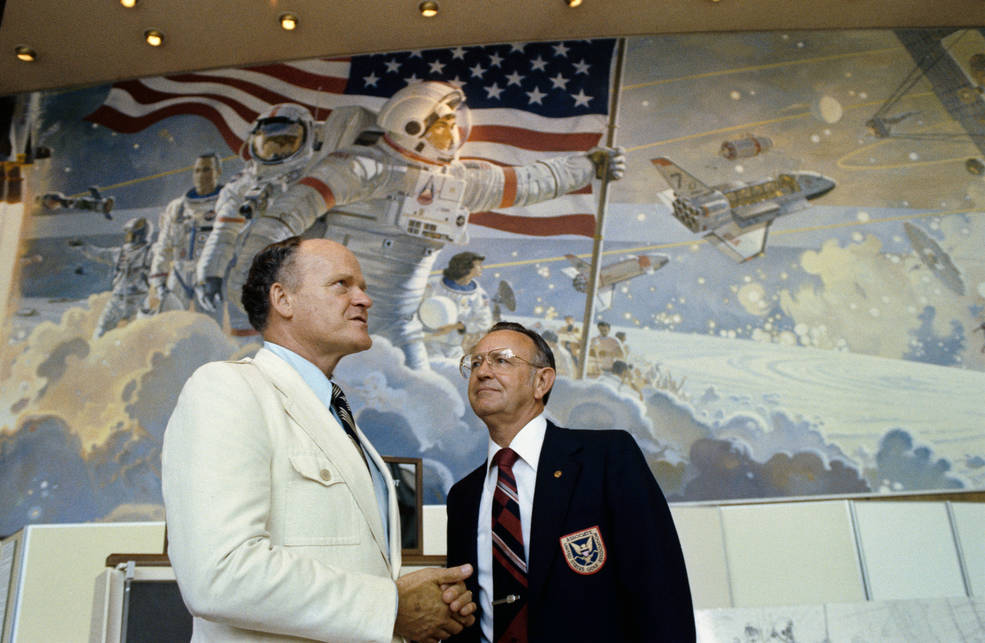 The next major project for McCall took him to the Johnson Space Center (JSC) in Houston. Christopher C. Kraft, JSC Director, commissioned McCall to paint a mural on the outside of the center’s auditorium, later named after Congressman Olin E. Teague of Texas who served on committees that oversaw NASA’s activities. In 1979, McCall spent several months at JSC painting the mural entitled Opening the Space Frontier – The Next Giant Step, illustrating NASA’s human space flight program, past, present, and future. He painted several JSC employees in the mural and used astronauts John W. Young and Judith A. Resnik as inspiration for two of the painting’s central figures. Astronaut Alan L. Bean, at the time a budding space artist, contributed by painting the astronaut pin in the mural. Dedication of the mural took place on June 19, 1979, and at the time the building housing the auditorium also housed the JSC Visitors Center, allowing the general public to view the mural.