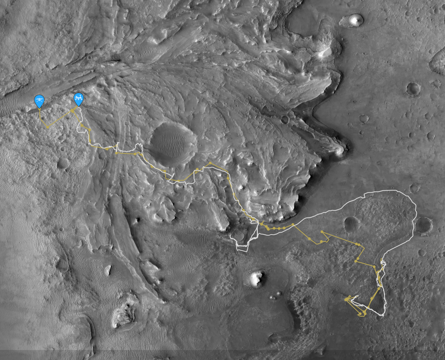 Left: The autonomous helicopter Ingenuity, near center of photograph, makes the first powered flight on Mars, imaged by the Perseverance rover. Middle: Routes of the Perseverance rover, white, and the Ingenuity helicopter, yellow, in Mars’ Jezero Crater. Right: A piece of cloth from the Wright Flyer’s wing attached to the underside of Ingenuity’s solar panel.
