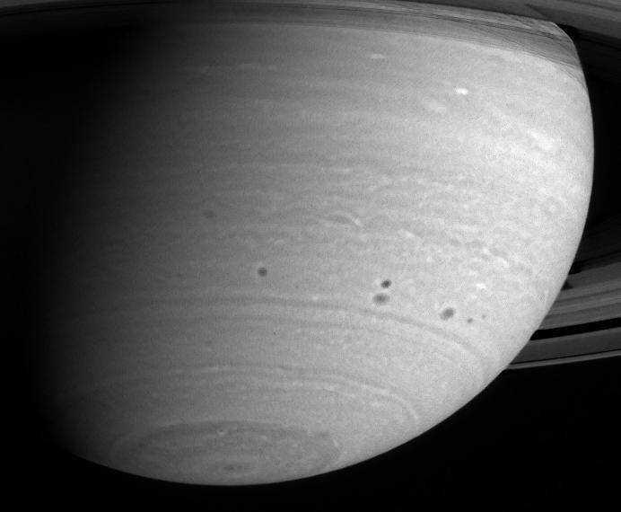 patterns in Saturn’s north polar region. Right: Large white storm in Saturn’s northern hemisphere.